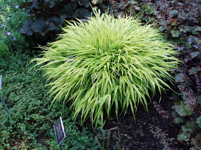 The image above was taken by Santos McGill, a wonderful photographer. This shot is in the garden and Santos is talented (and very patient) at waiting for the hummingbirds to get comfortable with him around and getting that perfect shot. Lots of hummingbird activity this time of year! Incidentally, the plant is the 'Black & Blue' salvia (Salvia guaranitica 'Black & Blue') featured in a previous blog. I like this time of year, both for the weather and the small "respite" before our busy October. Janice, Larry and Jerry did their normal Tuesday routines and Rick and Tony accomplished a lot more re-graveling and pressure washing. Kay, Heidi, Geesje, Barb, Bill and Kristine all helped out in the gardens as well. Tuesdays usually have both less staff and volunteers but we sure keep busy!Great grass below. This is the golden Hakone grass (Hakonechloa macra 'Aureola') that we've positioned throughout our partly shaded areas to offer both color and texture. It is slow growing and fairly expensive. However, it combines well with hostas and other bold-leaved plants that would be more prevalent in shady area. I don't feel that this grass can be over-used. The straight species (Hakonechloa macra) is green, although you can try 'Albo-striata' for white variegation, 'Aureola' as seen below is the standard but my favorite now is 'All Gold' (see at bottom, photo taken at Boerner Botanical Garden near Milwaukee) that literally glows. There is a new variety called 'Stripe it Rich' that has white variegation on yellow leaf blades that looks very promising. Another new variety is 'Beni-kaze' that is normally green but gets wonderful red tones in late summer thru fall. Regardless of the variety, Hakone grass is a must in the partly shaded garden.