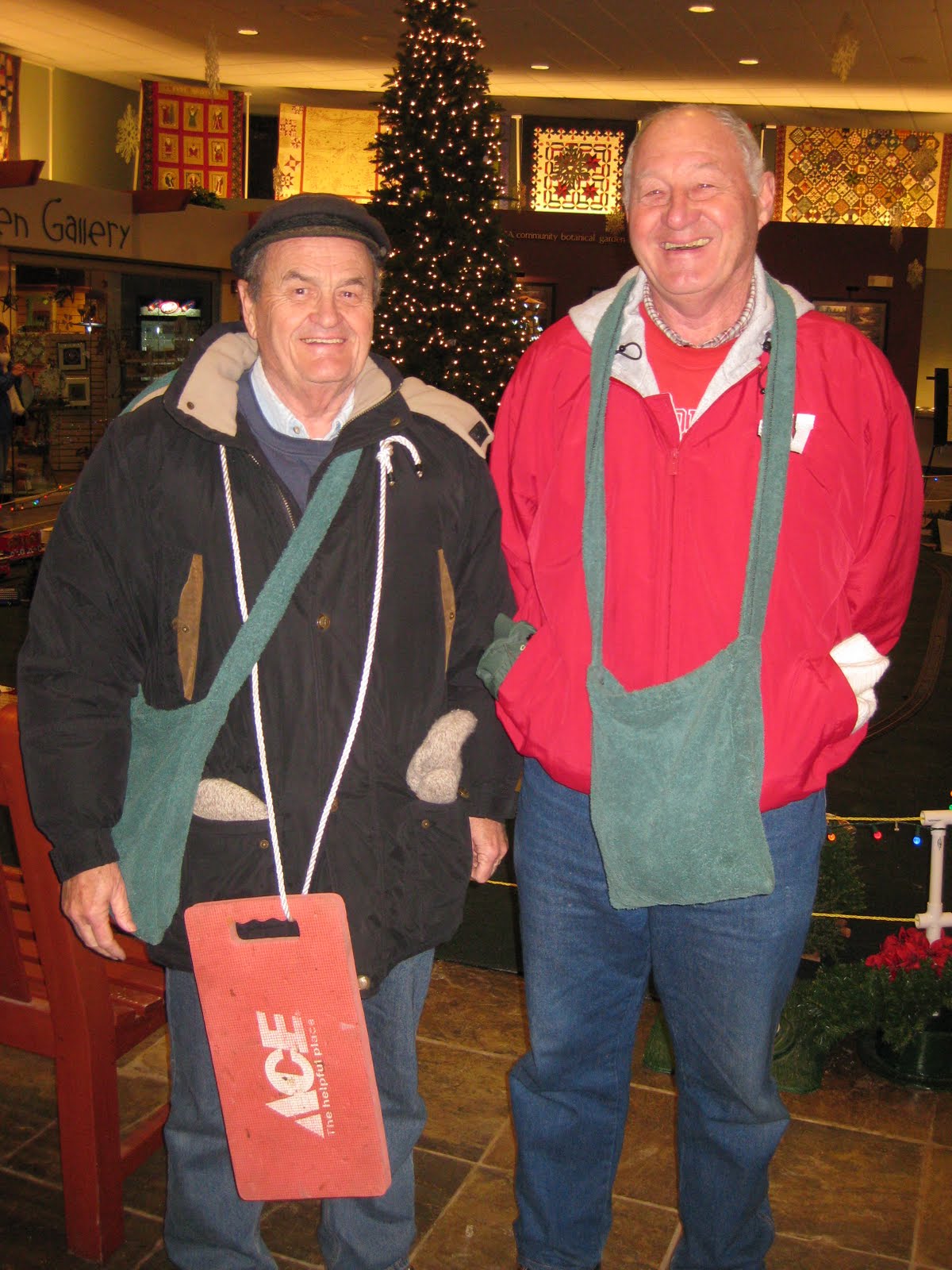 f they promise a return to the trains. We've seen kids entranced for hours in front of those trains. We had more great volunteer help last night but of course my pictures don't capture all the volunteers that work as greeters, ticket sales, gift shop help, quilt raffle helpers, trail walkers and refreshment volunteers. To the left are Bev and Ron who worked the ticket sales booth and are veterans at this task (and many others). To the right are Bob C. (left) and Maury (right) with their European shoulder bags (not man purses) with supplies for trail walking. Note that Bob has a kneeling pad around his neck which was prompted after his first night of kneeling on gravel at the HLS to replace 50+ luminary bulbs! With a chance of freezing rain tonight, we'll see how the show goes in terms of keeping things lit and attendance numbers. We're happy to see that we have almost reached our total attendance for the HLS from last year with 10 nights left to go!