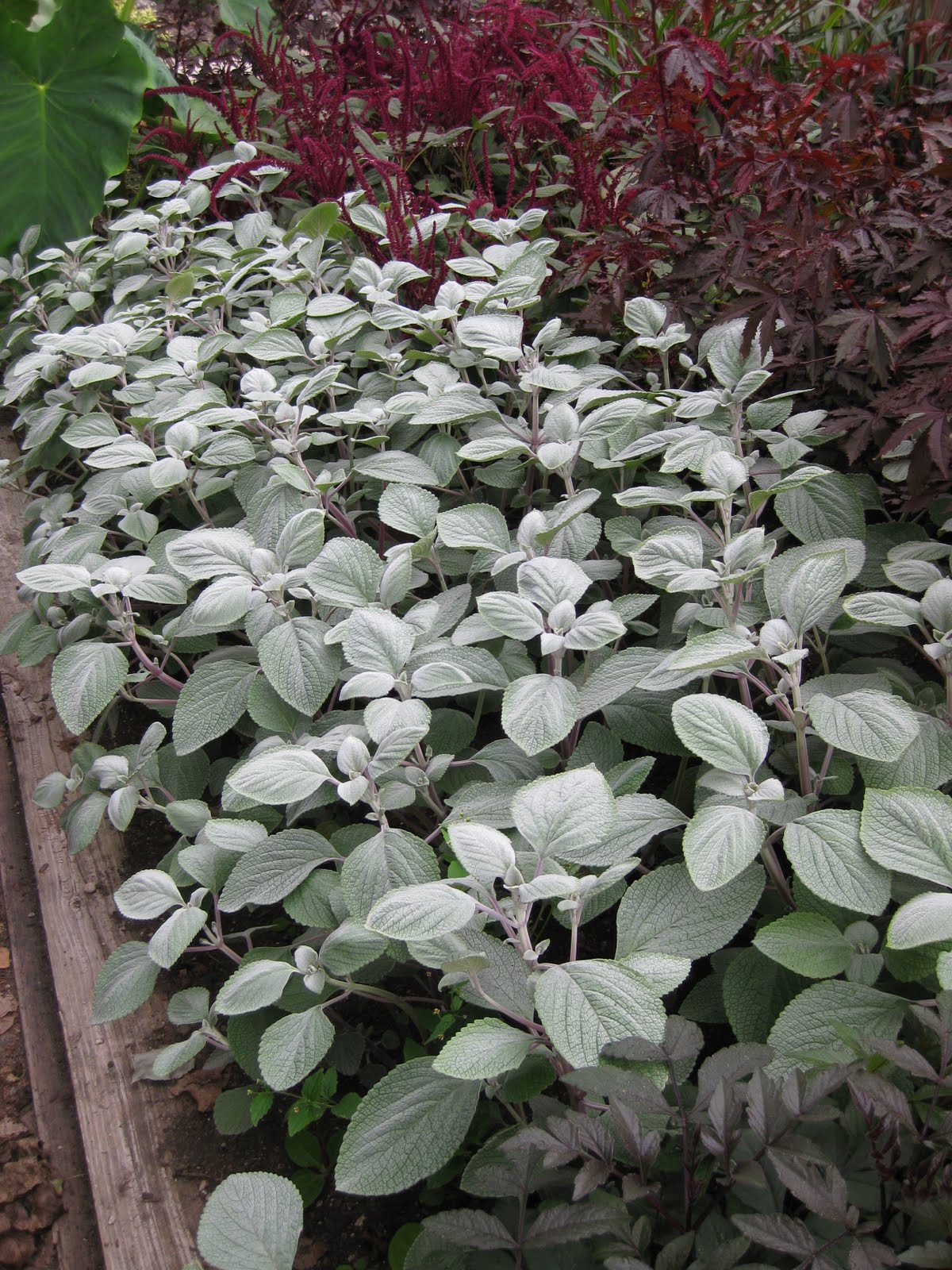 Brazilian Red Hots' calico plant (Alternanthera dentata). We've grown this variety for a couple years now (as well as many other varieties of calico plant) and it really catches the eye. To the right is the nice silver of the silver Swedish ivy (Plectranthus argentatus). The leaves of this annual are felty and this plant can reach almost 3' in height in a good summer (full sun, moisture and fertilizer). Note the value of silver as an "illuminator" in the garden.