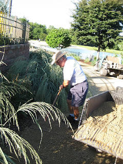 Populus deltoides) drop their leaves notoriously early. Pat (above left) did a nice job regraveling the road near the terrace while Rollie was out laying memorial bricks again. Dennis, Ron and Del set up two tents for the Smelly Garden program this Sunday afternoon (family drop-in activity, see our website!). The guys moved on to some other projects later on including hauling and spreading more gravel. Dick H. helped Pat later with regravelling and Dave, Jim, Vern and Bob continued to put up the new Japanese garden fence. Suzy, Marilyn, Karen and Glenna did a great job weeding and purging (removing spent annuals) the flower beds east of the visitors center. Above is Marilyn (blue shirt) amongst the jungle. Hal and Doris were also in to primp their garden and Dr. Gredler worked on myriad projects. We also saw Kelli, Kris, Mike M., Mary Kay, Laura, Joanne, Karen and many others. To the right is Sudan grass (