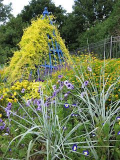 d some other general watering duties. I sprayed two batches of herbicide out in the gardens and targeted some of our weedier paths and garden areas. I also gave a tour for Ed Lyon and his staff from Allen Centennial Gardens located on the UW-Madison campus. Ed is currently Director at that garden and is former Executive Director here at RBG. He and his four staff (student interns) seemed to enjoy the visit and it was a beautiful day to stroll thru the gardens. We had oodles of visitors today and it was nice to see people enjoying the gardens. We also noted that there seems to be a bumper crop of butterflies, particularly swallowtails, this year. To the right is another shot of a previously featured annual in our blue/yellow theme. This is the 'Matsu