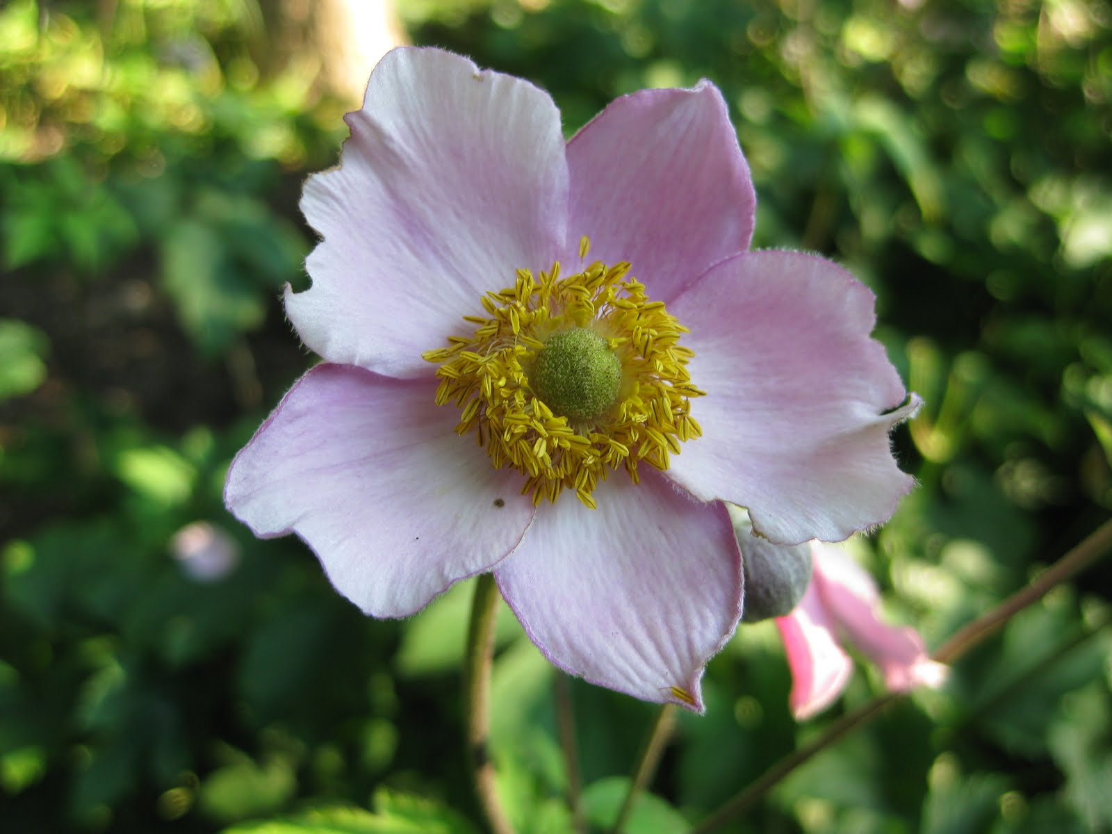 Nice shot above of one of our Japanese anemone varieties (Anemone x hybrida 'September Charm') starting to bloom in the shade garden. This is a close-up and ea