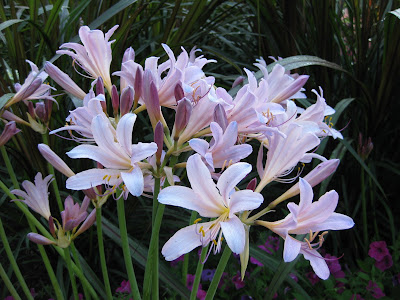 the Ornamental Edible / Compact Vegetable collection. She also did some watering and major fertilizing. We cut back the marigold collection severely and Janice fertilized it today in the hopes of a fresh resurgence of growth (and blooms) to replace the floppy, tired looking plants that were just recently butchered. I had many meetings today but was able to run irrigation and check on the progress of various projects out in the gardens. We also had the ribbon-cutting ceremony for our newly remodeled and re-vamped gift shop, followed by a Board meeting. To the left is the 'Pineapple Beauty' coleus (Solenostemon scutellarioides) with lime gold leaves and variable maroon markings on the leaves. To the right is a close-up of the resurrection lily (Lycoris squamigera) which always is a delight to see out in the gardens. The 200+ of these around the gardens (all blooming or starting to bloom) were planted way before my time and will be here when I'm long gone too. These long-lived plants, also called magic lily, surprise lily and the always controversial "naked ladies", can bloom within five days of piercing the soil. The foliage already came up in spring with tulips, died back with the tulip foliage and what we enjoy this time of year is the flowers on "naked" stalks. See the nice clump directly below. Tomorrow night, Wednesday (August 17th), is the Rain Garden lecture by Chrissy Regester of Walworth County UW-Extension. Held at the Parker Education Center from 6 pm until 8 pm, this promises to be a fun and educational program (free for RBG Members and $5 for all others). Come check it out and consider the Smelly Garden event his Friday, August 19th from 8 pm until 10 pm (see website for details).