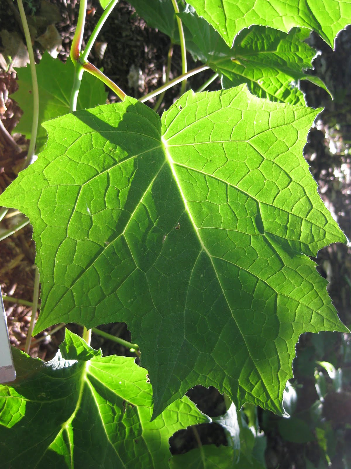 while Bill O. came in to also mow the arboretum and some other areas. Little Jerry popped in to help out and we also saw Maury, Dr. Yahr, Deb, Bev and many others. We also had a Horticulture Therapy Committee meeting that included Janice, Darcie, Karen, Art and me. To the left is the tropical-looking, back-lit leaf of the yellow waxybells (Kirengeshoma palmata). This perennial will bloom moderately with dangling yellow bells in a couple weeks but I've always enjoyed the textural contribution of the leaves in the part shade garden. To the right, with red obelisk in the background, is the always beautiful Persian shield (Strobilanthes dyerianus) which is one of the most asked about pla
