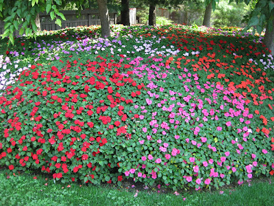 Lots of great volunteers today with Grumpies, Grumpettes, RECAPPERS, afternoon weeders, etc. Ron Y., Bob C., Dick H. and Del put up two more tents today for the plant sale while Rollie and Ron B. ran out to pick up our borrowed wagons for the plant sale. The guys moved on to other projects later in the morning. Pat worked on filling MANY buckets with gravel and these will be used for our plant sale signs. Dave, Jim and Bob continued work on the Japanese garden fence and Maury (and Pat) ran out for cardboard flats for the sale. Dr. Yahr was here and watered some newly planted trees while Dr. Gredler continued his aeration rounds. Our morning Grumpettes included Suzy, Karen, Mary and Glenna. They did a nice job weeding here and there. Our afternoon crew (Mary, Nancy and Myrt) also weeded but ran in to the tough temperatures and stayed in the shadier gardens. Jumbo Jim came with two RECAPPERS and their timing was perfect to help unload plants and water all the new plant sale items. Hal and Doris were in to primp their garden area as well. We also saw Kelli, Lilian, both Bill O's and many others. Above and to the right is the 'Elephant Head' amaranth (Amaranthus gangeticus) with such interesting flower clusters. And who says red, orange and pink can't go together!? When it is a "quilt" of impatiens (directly below), it will always look good. These plants are all over 24" tall and have filled in nicely. Last year a photographer apparently had their clients stand in the middle of this (yes, unbelievable, but it happens!) for a photo and it was pretty beaten down.