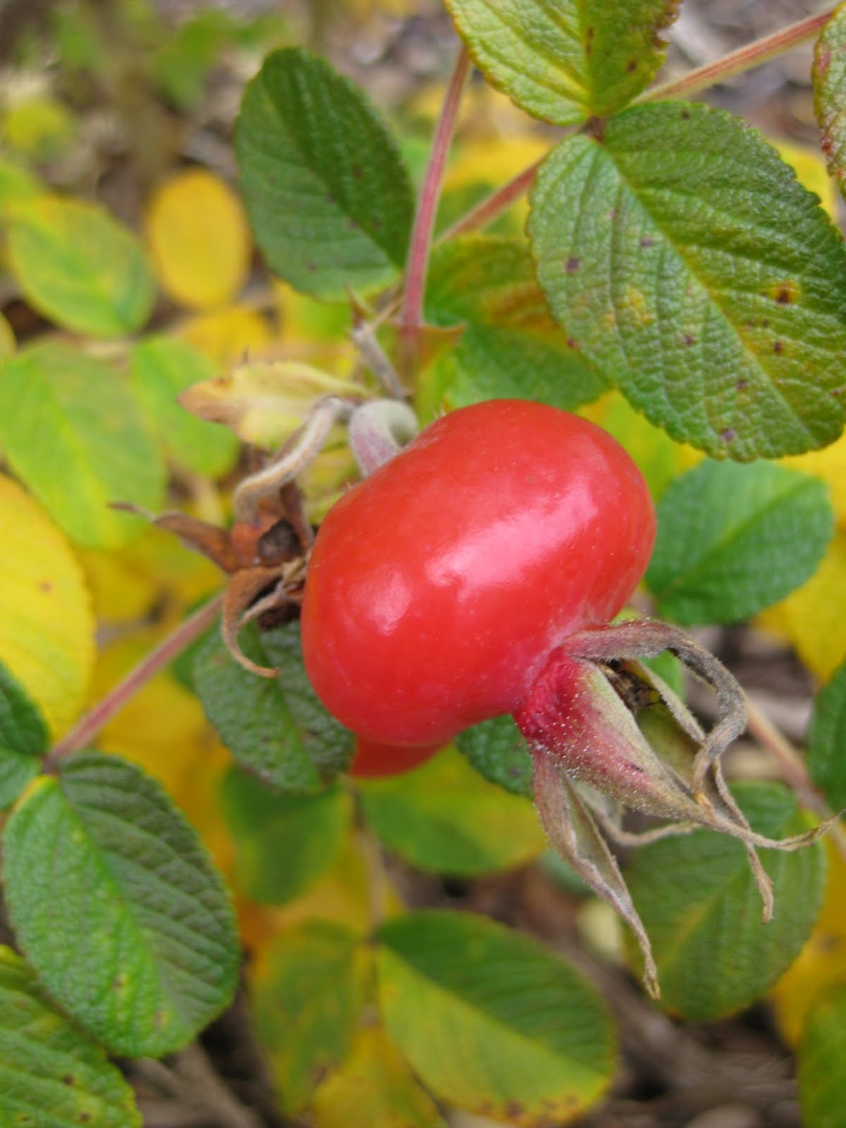 anese rose (Rosa rugosa var. rubra). The hips are quite showy this time of year and have a long history of many uses. Research rose hips and their uses and you'll be amazed. They are also higher in vitamin C than oranges.Next Monday we go on our annual tree run to cut, load and haul back 150-200 white pines (Pinus strobus) that we use as temporary displays for the Holiday Lights Show (HLS). These are donated by Paul's Tree Farm (Avon, WI). We secure them on posts (recently pounded in) and then decorate them with lights. We do many grouping of trees that look great with some light snow. This has been an annual trek and we typically get 10-15 Grumpies to help with this process. Outdoor volunteerism in the gardens will dwindle by the end of the month as we finalize the lights show and finish our fall clean-up tasks. Our carpenters keep busy thru the winter and once the 2012 New Year hits, we head out and start dismantling the lights show. It is still a busy time now though and we hope our efforts with the HLS are rewarded with 10,000+ visitors. A recent, $15,000 grant from the WI Dept. of Tourism should help bring people to the show. To the right is the superior fall color of one of our oakleaf hydrangeas (Hydrangea quercifolia). Below is an annual pot marigold (Calendula officinalis) hanging in there. This "cool season" annual can take tough months of April and October (doesn't enjoy the summer heat though..) and I was surprised to see this one hanging in there. At the bottom is the fall color on our golden Japanese kerria (Kerria japonica 'Chiba Gold'). This variety has golden foliage in summer too (most cultivars have green or variegated foliage) although there is a variable white pattern on many of the leaves. It was interesting to see the intense yellowing fall color but the remnants of some of that white pattern.