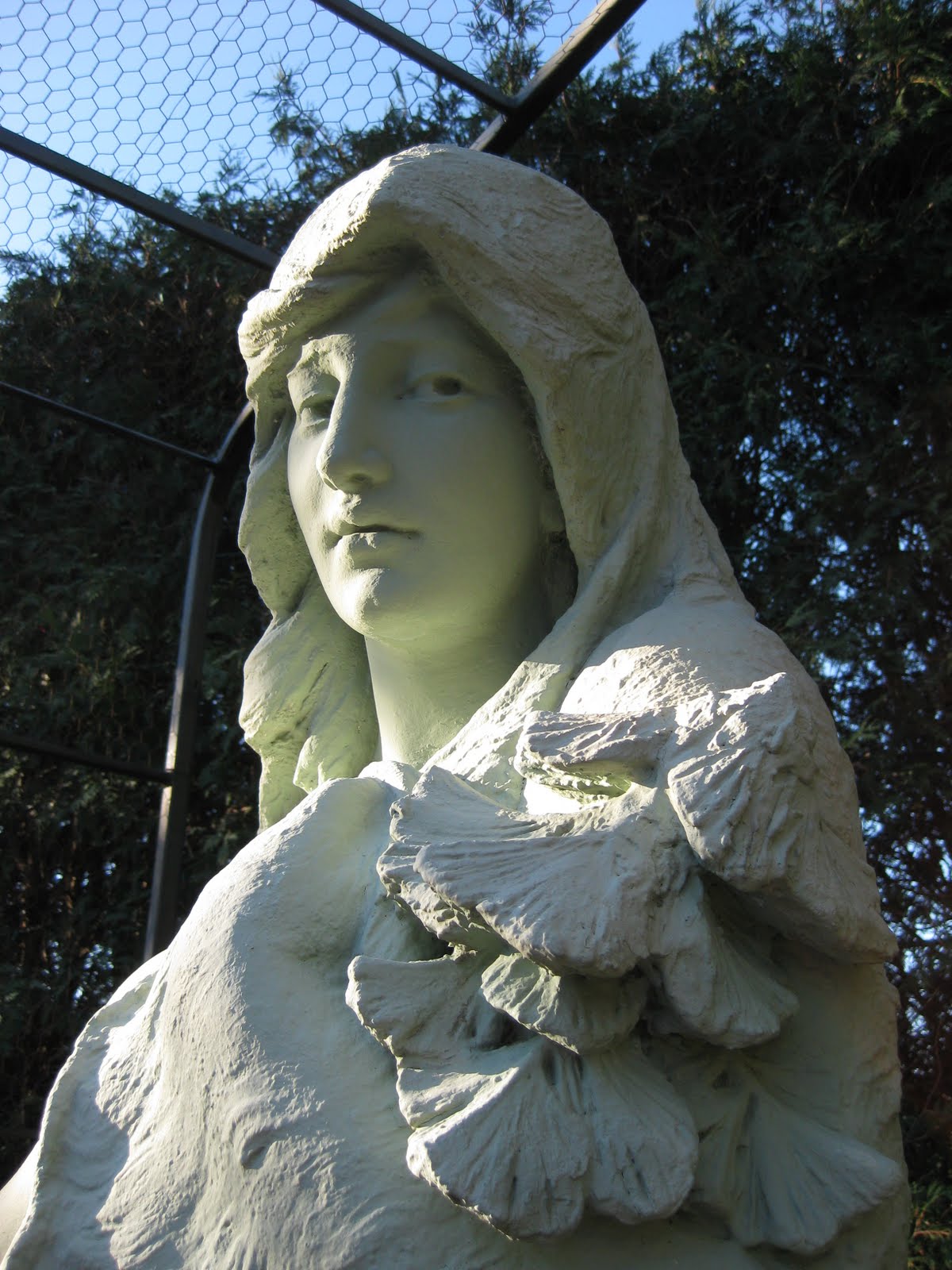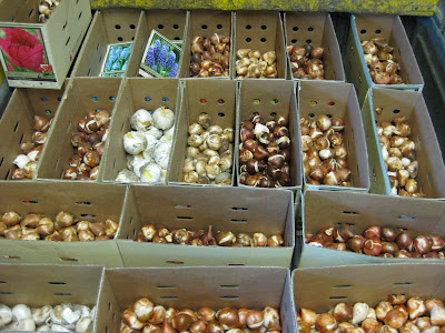 garden. She sure has an intense stare as she protects Mother Nature and watches more decorations installed in that garden area. This sculpture was originally on top of the House of Mercy nunnery over 100 years ago. The House of Mercy was the start of the vast Mercy Health System in our area and down in Northern IL. This statue is on permanent load from the Rock County Historical Society and is an important (and recognized) feature at RBG. Other volunteers today, aside from Mary W. mentioned above, included Pat who continued scraping off our cocoa bean mulch from around the roses. We like this type of mulch for function and appearance but I don't feel that it breaks down consistently and does develop mold problems. We re-apply this mulch every year (fresh). We also saw Don, Maury and others at the Hort Center today. Maury, Dick P. and Gary helped me (thankfully) put up the huge screen for the symposium today. I've done this before with Mike M. in the past and it is a challenge to say the least. To the right is the fall color of the native nannyberry viburnum (Viburnum lentago) in the color rooms garden. Directly below are the bulbs I hauled out for our planting project this morning. That area should look dynamite in May of 2012!