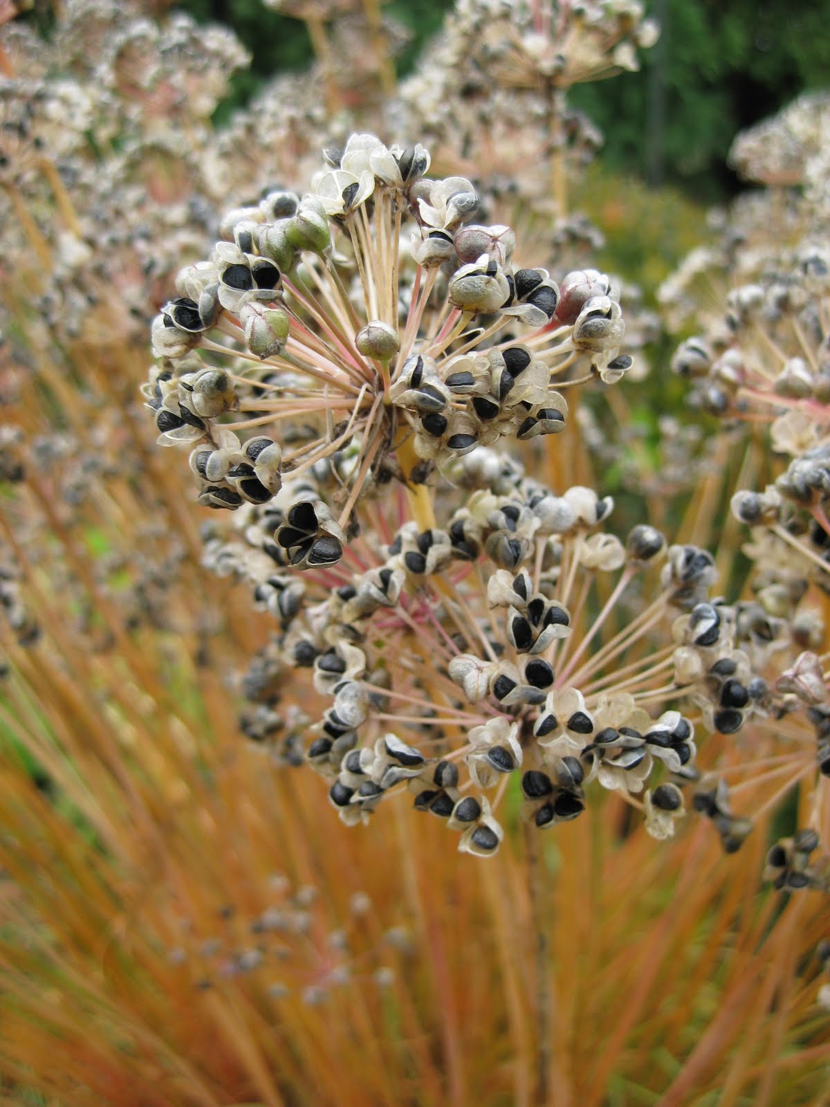 Round-Up on these target plants as it will still have time to kill off these plants before snowfall (hopefully). As you're cutting back your garden, anything that elicits a "Hey, I didn't plant this" should be followed by the action of immediate removal, saving you time and headaches when diverse spring duties might be more of a distraction. The top image is the fall appearance of garlic chives (Allium tuberosum) which were blooming in August and September with beautiful umbels (rounded flower clusters) of white. However, these culinary chives should be deadheaded before they go to seed as seen above and more specifically to the right. Look at all those seeds ready to fall and germinate next spring. With these potential seed clusters not removed in a timely fashion and left to drop seed, the end result next spring is a solid mass of grassy babies throughout the garden that will need to be culled, thinned and dealt with immediately. There are many other plants/perennials with similar challenges. While they have beauty and/or function in the garden, those rampant re-seeders should have flowers removed prior to seed set/seed drop to keep control of unwanted spread.Now is the also the perfect time to target the notorious European buckthorn (Rhamnus cathartica) which has invaded a good portion of the Midwest and Eastern United States, particularly woodlands. We have some around the periphery of RBG and will find invaders that have disguised themselves well in the gardens proper. The woodlands around our area are thick with this non-native woody plant that has a competitive advantage in our woodlands in that it leafs out earlier and is tolerant of full sun to full shade. When I worked in MI, I observed woodlands that were so thick with European buckthorn, you couldn't walk thru them. The floor of those forests, instead of having native perennials, ferns, etc, were barren as there was almost no light due to the understory of buckthorns, This solid mass also outcompetes a native understory of trees which is what will replace our larger desireable trees as they die and leave an opening in the woodland canopy. There are lots of articles on this notorious tree but suffice it to say that it is a Thug with capital 'T'. However, this time of year, buckthorn becomes very conspicuous as it retains green leaves well in to December so as I type, you could walk thru a woodland (or your garden) where most deciduous trees and shrubs have dropped leaves or are in the last stages of fall color and note those specimens with green, glossy leaves. See the picture below which was taken at RBG yesterday. The desireable shrub, an arrowwood viburnum (Viburnum dentatum) has lost most of its leaves although you still see some yellow ones to the left. The stems (marked with blue tape) that have green leaves are from a buckthorn that has "hidden" in the midst of this shrub for years as it blends in well during the summer. That buckthorn was planted by a bird that ate the black fruits (drupes) of a female buckthorn and pooped them out while hanging out in that shrub. Bird dispersal, far and wide, of this non-native is what has given it such a wide range of invaded territory. Now, this multi-stemmed shrub is so entwined with the viburnum that digging it out is not a real option. By the way, hand digging out buckthorn is a monumental effort and the wood is extremely hard and difficult to cut. The branches also have terminal spurs which for all intents and purposes, can be considered "pseudo thorns" as you try to remove and dispose of the wood. Be careful and wear gloves and eye protection. Steel toe boots would not be overkill either.