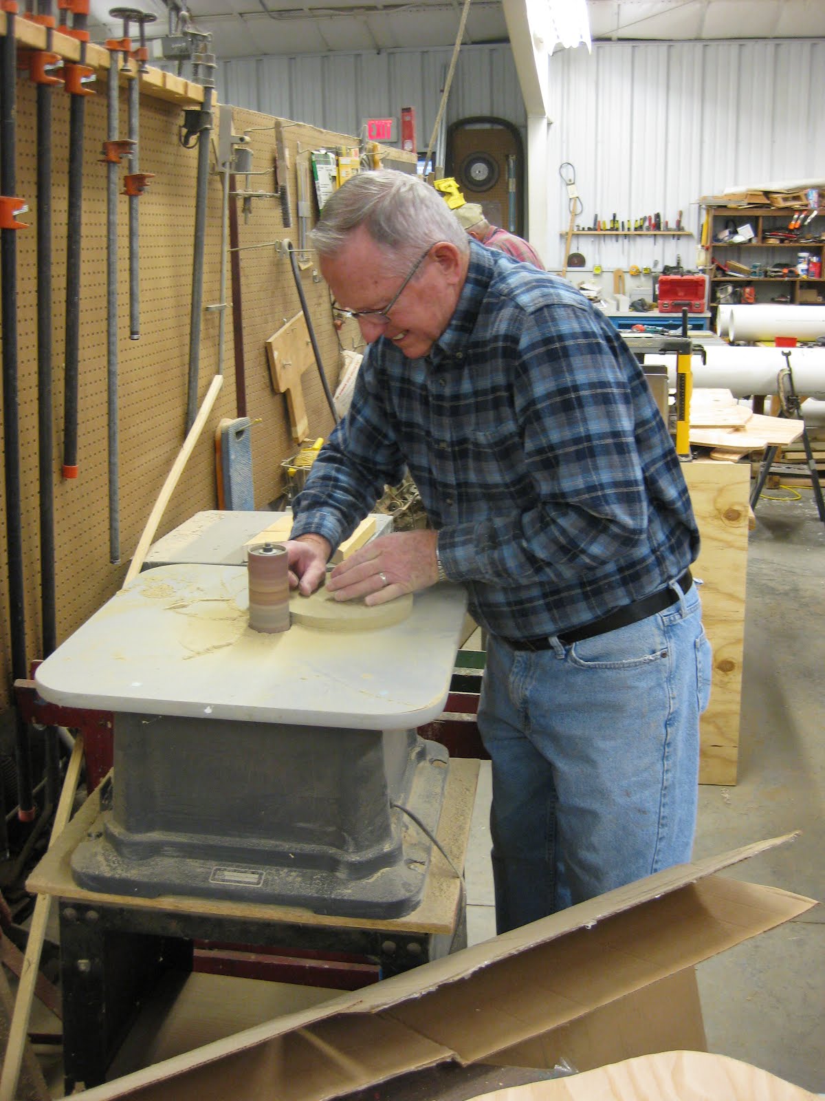 rs. Bob A. can be seen to the lower right smoothing out some plywood circles that are being secured in the ends of the 8" diameter pvc piping. This will hold the soil in and all these "pipe planters" will be painted next week by Rose (who also popped in with her "better half", Urban). Maury went on a paint run, replaced light fixtures and helped as needed. Dick H. helped with some of this work today and finalized repairs on the truck we'll be selling (hopefully soon!). Del and Dick W. worked on processing more plywood deer and sleigh cutouts and getting them ready for painting. Our carpentry shop was as crowded as ever! Larry and Bill worked on a bunch of project together including replacing the choke cable on our Grasshopper snowblower which will need to be ready tomorrow. The guys also picked up some nice donations from a local vendor that