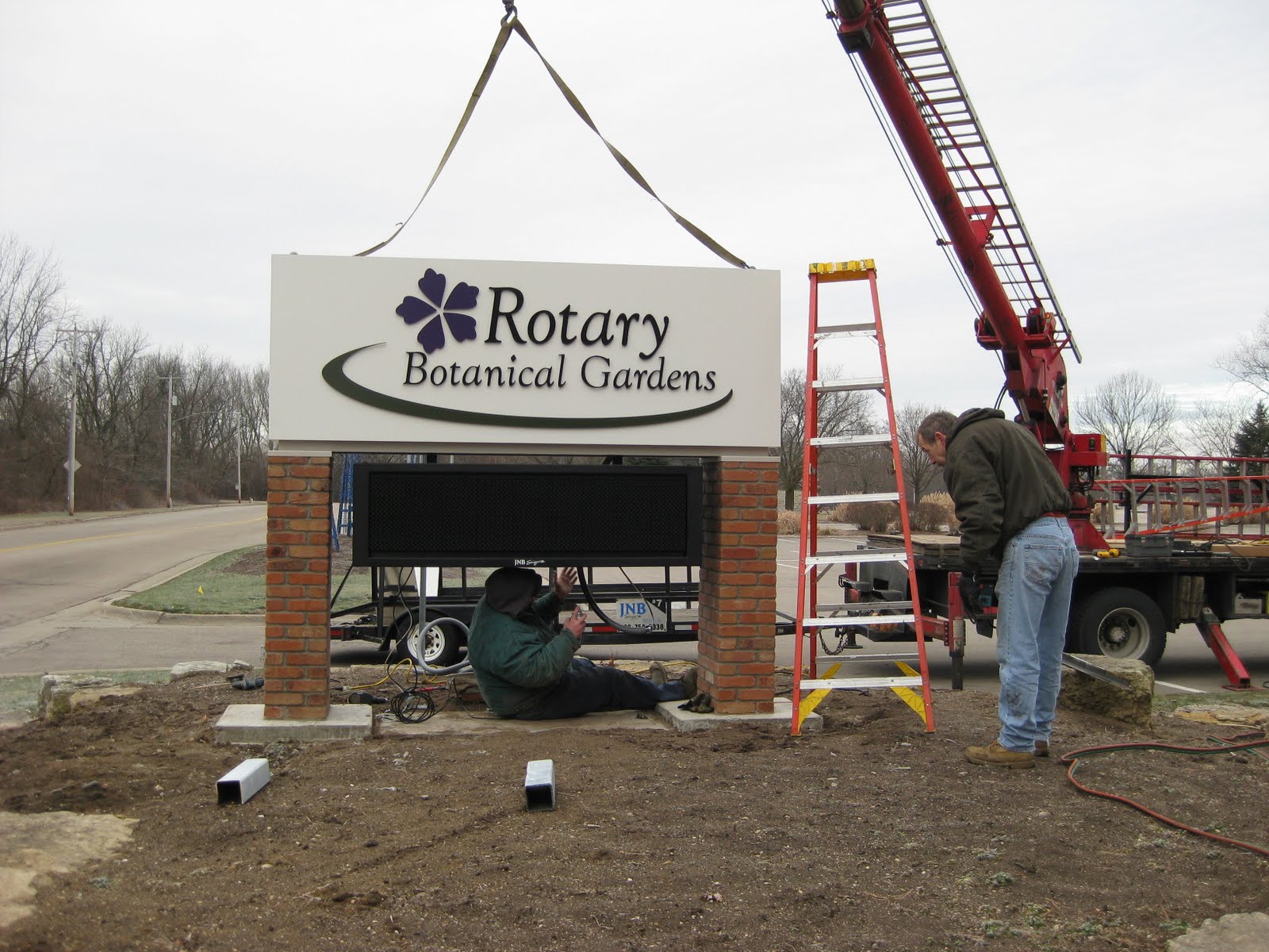 alled throughout the morning. My second meaning was a reference to the crazy weather patterns we're seeing with yet another winter day that is more like April than January! More on that later. Tom and Maury were to finish connecting the electrical service to this sign once installation was complete. The new sign has a double-sided digital display (the black box underneath) that will be programmed with information and messages from a computer in the Parker Education Center. I believe the lettering is not the uber-bright red but a "tasteful orange." There was some debate about having a digital sign in this area and it actually took City Council approval for an allowance to install this sign. The sign itself (installed by JNB Signs) is being entirely funded by a g