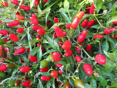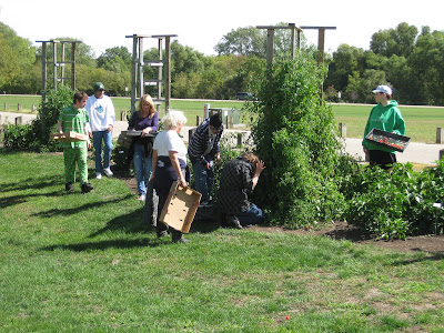 The grounds staff bounced between various tasks which included watering and preparing for the weekend weddings. Big John push mowed this morning and moved on to removing two good-sized purple-leaf plums (Prunus sp.) that really needed to go. Terry started the day with some backpack blower rounds in the main parking lot which was becoming quite messy. He also push mowed, watered and worked on some other projects. Janice made some signs this morning and later went out to work on tidying up our moss collection, debris collection and container watering. Marv spent a good portion of the day using our CASE endloader near the Horticulture Center. He finished his graveling job behind the Horticulture Center but is also excavating an area where we will soon establish a gravel pad for a small greenhouse that will be donated to the gardens. We'll have three small greenhouses that we'll use for various purposes between April and November. We wont heat these houses but they will be invaluable for storing tender plants in spring and starting tropicals earlier each year. Marv also ran irrigation, watered and worked on other projects in the afternoon. I was in the gardens briefly this morning but actually spent a good portion of this fine day inside. Marianne freshened up the cutting display and worked on producing new labels for our recently planted alpine perennials. My desk work commitments increase each year and are easier to stomach on the rainy days! Directly below are the wispy seed heads of the 'China Purple' bush clematis (Clematis heracleifolia). They still have some color but those structures are also quite engaging in terms of texture. The next photo down features the showy fruits of the 'Chichen Itza' hot pepper (Capsicum chinense) that are considered a habanero-type. The fruits ripen from green to this orange and the heat is intense at 180,000 Scoville units. This variety is in our vegetable beds at the Horticulture Center. Not far away are the 'Super Chili' hot peppers (Capsicum annuum) seen in the next photo. This semi-compact plant features a profusion of upwards facing, cone-shaped fruits that mature to this red. This All-America Selections winner (1988) is ranked at 50,000 Scoville units so still packs quite a punch. At the bottom are some of the hardworking Chestnut House volunteers that were lifting potatoes yesterday afternoon near the Horticulture Center.