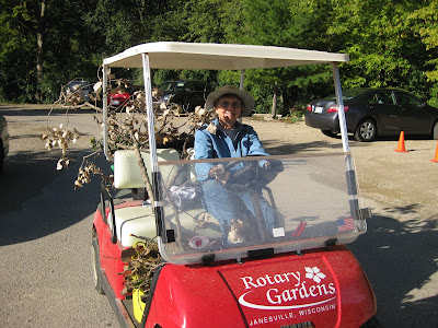 We saw quite a few volunteers today and it again was the perfect day to be outside. Kay, directly below, was here all morning. She spent her time tidying up her assigned portion of the shade garden. She also went thru many other areas with the focus of removing spent annuals and collecting leaf/twig debris. She is one hard worker and has been a consistent and impressive help at the gardens for many years now. The next photo down shows Ron K. in the woodland walk garden. Ron accepted the responsibility to maintain this garden space as an assigned gardener this past April. He has done a spectacular job and has the most square footage to maintain of all our assigned gardeners. Today he was planting more perennials in open locations and next week, he'll start to plant some bulbs. I've warned him about the 3,657,896 leaves that will soon flutter down in to that garden! We also saw Amy, a new volunteer, this morning. She spent time in the sunken garden tidying up before the wedding tomorrow. Dr. Gredler did his mowing rounds this morning and we also saw Dr. Yahr and some others as well.