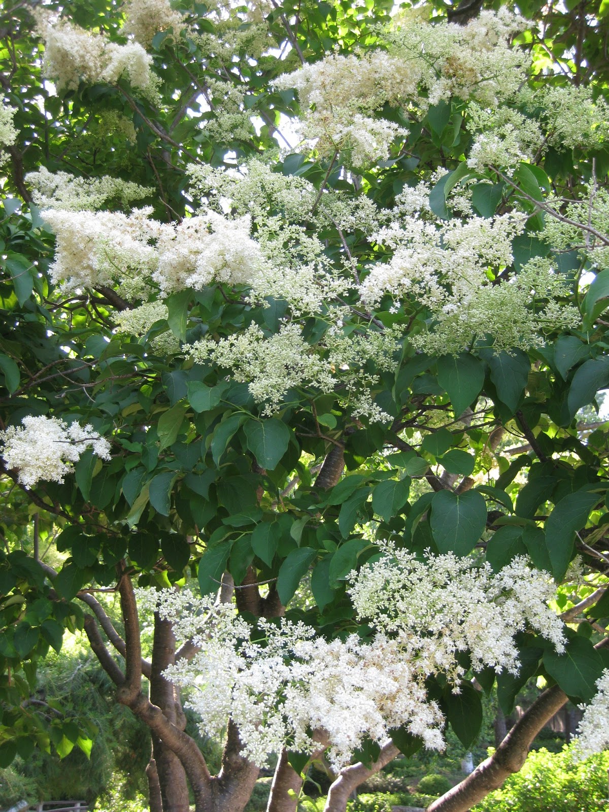 Although the rain on Saturday morning thwarted our planting efforts, we caught up quickly today with planting and many other gardening tasks. Both today and yesterday were hot and sunny although the temperature will dip down to the low 70 degrees F tomorrow for the high. Directly above are the "orchid-like" blooms of the Northern catalpa (Catalpa speciosa) in the main parking lot. This was one of the twelve, urban-tolerant trees that we planted last year (WI DNR funded grant) with an emphasis on their added value as an ash replacement if / when Emerald Ash Borer (EAB) starts depleting the local ash (Fraxinus) population. Directly below is a colorful leaf from the 'Blazin' Rose' bloodleaf (Iresine hybrida) which is quite colorful and one of our favorite tropicals for part shade. The next photo down shows the 'Ivory Silk' Japanese tree lilac (Syringa reticulata) blooming nicely in the Japanese garden. The third photo down shows a bloom from the 'Orange Marmalade' Martagon lily (Lilium martagon) in the gazebo garden.