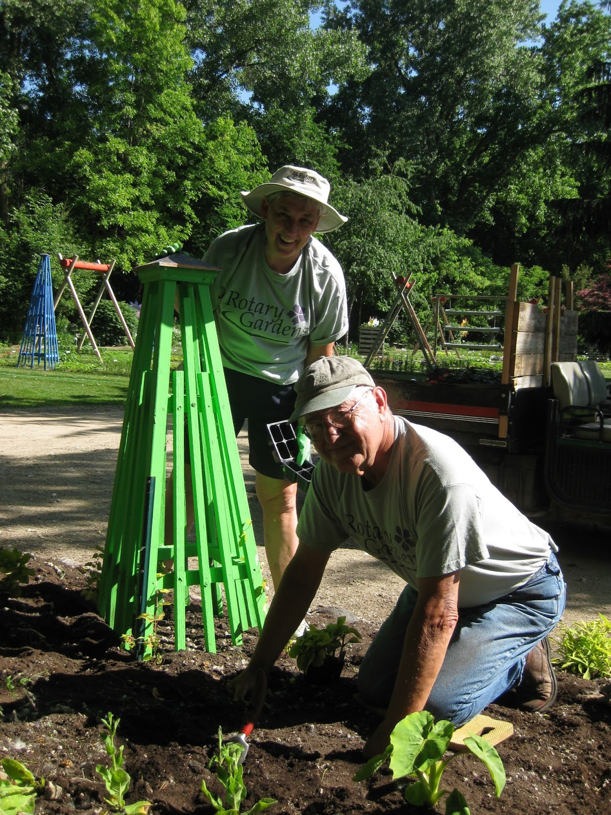 It's interesting how our volunteer attendance has fluctuated over the years. In the past, Tuesday has been relatively quiet although today saw an amazing turnout of volunteers. Ron K. (above) continued tidying the woodland walk garden and planted more perennials in this colorful space. Pearl and Don (directly below) planted their assigned garden space with a nice lime theme this year. They were here most of the day and did a great job installing over 1,000 plants at the far edge of the shade garden. The next photo down featured Bev and Ron who did a nice job of planting about 500 marigolds (Tagetes patula 'Durango Gold') just inside the gardens from the main parking lot. They made quick work of that project and will continue some efforts in the sunken garden later in the week. Cookie, Resa and Kay (third photo down) spent their time weeding and planting in the Nancy Yahr Memorial Children's Garden ("Pollinator's Paradise"). The ladies did a thorough job of cutting back bulb foliage and weeding before planting hundreds of annuals for the summer theme. Mary H. (fourth photo down) was in for some clean-up and Dr. Yahr did some planting for us as well. Mary and Roy (fifth photo down) did a nice job of installing more plants in our "Giant Garden" including many tropicals. Bob T. did more air edging just east of the English cottage garden. Dr. Gredler and Bill mowed and we also saw Chuck S., Mary W., Lois A. and other Janesville Area Herb Society ladies.