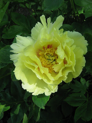The grounds staff kept busy from start to finish today. Larry had push mowing duties, installed some mailbox/signs (to hold information) and did plenty of watering the old-fashioned way with watering cans. Big John collected pansies (Viola x wittrockiana) from our spring containers (in advance of Cora planting the summer scheme today)., push mowed, planted the rest of the new roses, composted, rototilled and watered. Janice cleared a large area of bulb foliage, did a nice job on the cutting display, watered and spent time preparing for the Volunteer Potluck this evening. Cheryl did a tidy job cutting back daffodil (Narcissus) foliage along the front slope in advance of us preparing it for planting this Saturday (volunteer planting workday from 8 am until 12 noon!, next two Saturdays!). She then shifted to removing bulb foliage and weeds from the west section of the shade garden which needs some new plants shortly (maybe tomorrow). I ran plants out for Cookie, Resa and Cora and staged plants for our volunteer planters tomorrow. Directly below is the viper's bugloss (Echium vulgare) in the English cottage garden. This biennial is great for bees and has a nice shade of blue flower spikes (smaller trumpet shaped flowers) in to early summer. This native of Europe has been a hit in this garden for many years. Unfortunately, the last three photos are of unknown varieties of a rhododendron and two tree peonies (Paeonia suffruticosa) respectively. The beauty is amazing though!