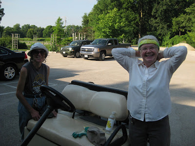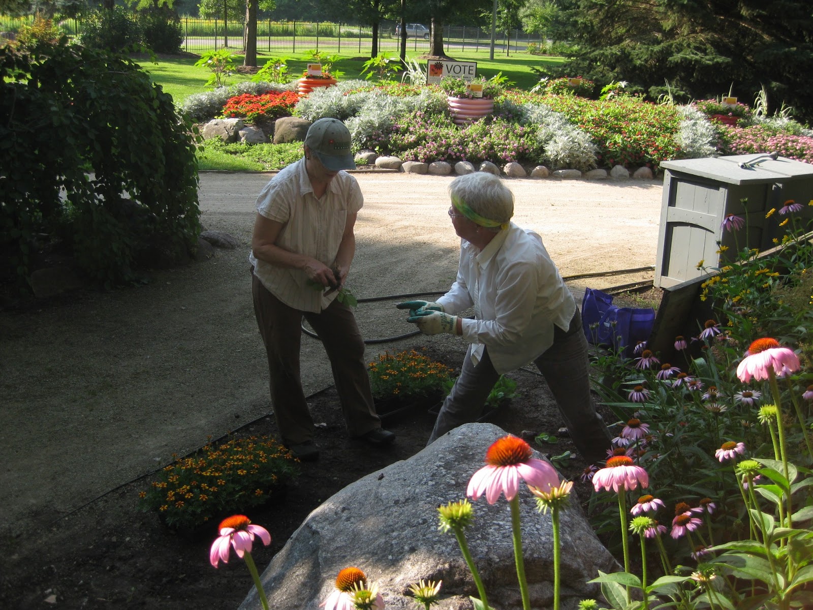 We had some great volunteer help primarily this morning when it was cooler (which makes sense). Above are Eva (left) and Kay (bandana girl). The ladies, along with Patrea (seen below left with Kay) planted close to 1,000 annuals this morning near the gazebo. We had some space to fill and this was a great spot to direct some of our "filler annuals" for color. We will frequently keep surplus annuals in our holding yard throughout July to address any plant losses, new gaps, container pockets or other immediate needs. The three ladies did a great job. Ron K. tidied up the woodland walk garden all morning and Janet did a nice job touching up the "lime wall planting" which has been her assigned garden area for many years. Stan worked a good portion of the day in the Japanese garden and both Dr. Gredler and Bill O. came in for mowing duties. Dr. Gredler can be seen two photos down working on some turf repair which is one of his many duties as the "Superintendent of Sod." Chuck S. came in to clean up our new cart and gave a cart tour this afternoon. Dr. Yahr handwashed many of our garden area signs which benefited from his attention. Bob T. was also in for some afternoon air edging duties. We also saw Tina B., Marsha, Ron W., Mary W., Vern B., Jim D., Bonnie D. and many others.