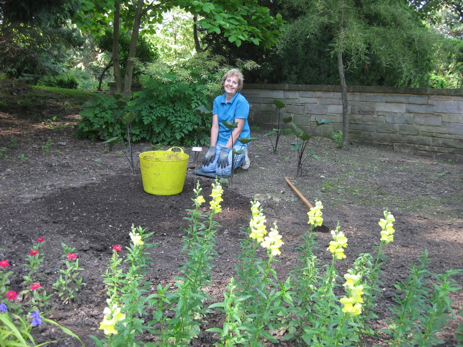 As usual, we had a nice showing of volunteers and were able to tackle a wide range of work. Above are Dr. Gredler (left) and Dr. Yahr showing off their new shirts (thanks Paul T.!). Note below that Dr. Gredler's title has been included on his shirt as well. With Dr. Yahr wearing stained and torn shirts all the time, we thought he could use a couple new ones too! Dr. Gredler did his mowing rounds today as did Bill O. Rese and Cookie (second photo down) tidied up the North point garden and did some significant planting on the east end of the gardens as well. Bev D. (third photo down) was in to weed her section of the sunken garden and we'll follow up with more plantings in the near future. The fourth photo down shows Tina B. who was part of the team including Kay, Patrea, Mary W. and Eva that planted and weeded in the ornamental edible garden. The ladies did a fantastic job planting and while we still need to accomplish more planting, their aggressive shift to weeding in that area will pay off as well. The next photo down shows Janet near her lime wall planting. The photo beneath that features some of her handiwork. The lime them actually extends and "snakes" through other areas as well and is really filling in nicely. We (Lori, Mary and I) had a meeting with some our Garden Ambassador volunteers including Russ, Eva, Stan, Larry H., Arnie, Tony, Londa, Dennis and Gena. Stan stayed later to work in the Japanese garden. Pat C. was working on labels including matching them out in the gardens. We also saw Lois, Maury, Dick P. and many others.