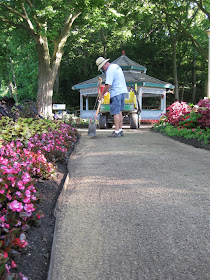 Volunteers were a vital part of all the activity today. We had a strong turnout of both Grumpies and Grumpettes (like Suzy above and both Marilyn and Shirley below). Suzy, Marilyn and Shirley (second photo down) did a great job weeding and planting in the Nancy Yahr Memorial Children's Garden which currently has our "Pollinator's Paradise" theme. The ladies put in another 500 "filler annuals" to address some new (and old) gaps. They shifted to weeding then with Steve in the formal gardens. Karla and Eva were planting near the arboretum (more gaps) and also shifted to weeding. Bob C. and Zach skimmed more path gravel and tidied up along the edging near the shade garden. Ron B. continued organizing pots and Dr. Gredler was in for more mowing. Dave T., Vern, Jim and Ron Y. worked on some carpentry projects and installed some of our new NO TRESPASSING signs. The guys have some future projects to accomplish soon including making benches and creating "coyote cutouts" out of plywood to keep the geese (and their poop) away. We also saw Larry H., Maury, Mary W. (office work), Dr. Yahr, Judy L., Ray, Art and many others. Further below are some neat plants seen today. Note that the Potter Daylily Collection is at peak as evidenced in the three daylily (Hemerocallis) samples below.