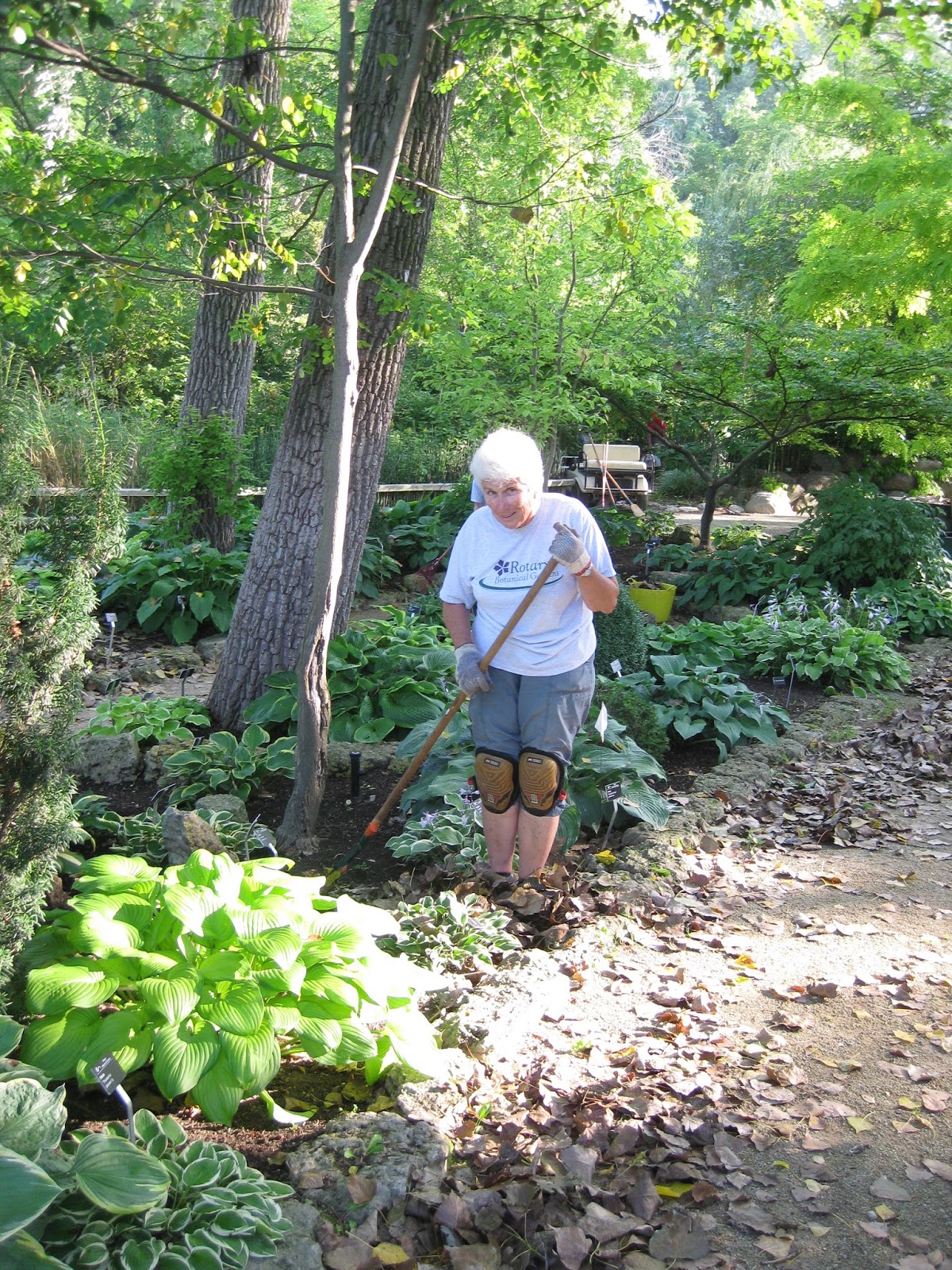 We had a crazy morning with lots going on around the gardens. A group from UW-Whitewater had a function at the Parker Education Center which made for a full parking lot and lots of visitors. We saw many people out in the gardens as well and had Susan and Jesse from the Ball Seed Company (West Chicago, IL) come to tour the gardens. We had a very strong turnout of volunteers including our stalwart Grumpies and Grumpettes. Needless to say, a wide range of activities occurred today but ultimately, we saw Marilyn (above in the hosta hollow garden), Winifred, Karla, Vicki, Eva, Mary R., Doris R., Jenny E., Betty H., Geesje, Pat R., Joan F., Corky F., Steve, Larry H., Bob C., Zach, Ron B., Dick H., Del, Ron P., Dave, Vern, Jim, Mary W., Rollie, Dr. Gredler, Dr. Yahr, Maury and many others. In lieu of relating all their many duties, suffice it to say they all did a great job with various tasks such as leaf collection (darn those cottonwoods!), skimming gravel paths, weeding, collecting debris, watering, organizing the pumpkin collection, carpentry, etc. Below are some shots of a few volunteers at RBG this morning.