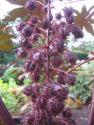 spiky seed capsules of the 'New Zealand Purple' castor bean (Ricinus communis) - annual