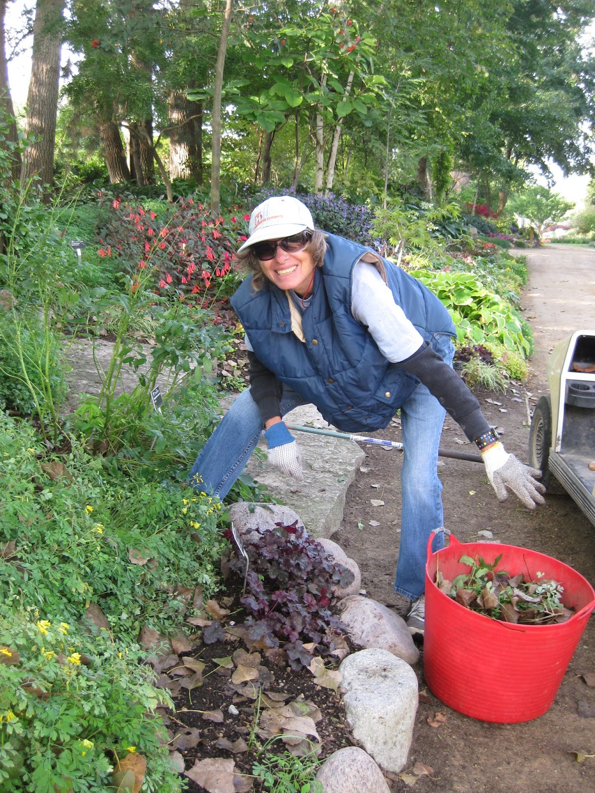 While there was plenty of frivolity today (see Patrea in stripes and Kay above), the volunteers accomplished a wide range of tasks. Patrea, Kay, Eva (below) and Pat R. all worked in the shade garden collecting leaves, weeding and tidying. They did a wonderful job and brought back many loads of debris. Vicki, Steve, Tina B. and Doris R. helped "un-tag" the perennials in the plant sale which involved removing our pricing from all the plants going back to our vendors. Tina moved on to watering the mums, Doris to sign processing and both Vicki and Steve headed in to the gardens to pick vegetables and tidy in the ornamental edible beds and Rainbow Garden. Stan was in to work in the Japanese garden and both Dr. Gredler and Bill O. worked on mowing around the gardens. Vern was working on carpentry projects all day. Janet T. spent some time tidying up the lime wall which still looks spectacular. I hope some of the 7th graders that helped plant that wall in May came back to see the results of their labor! Magda did some solid planting in her garden space and we also saw Betty H., Deb G., Joy O., Shirley B. and many others.