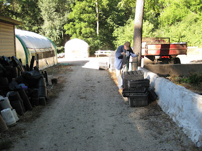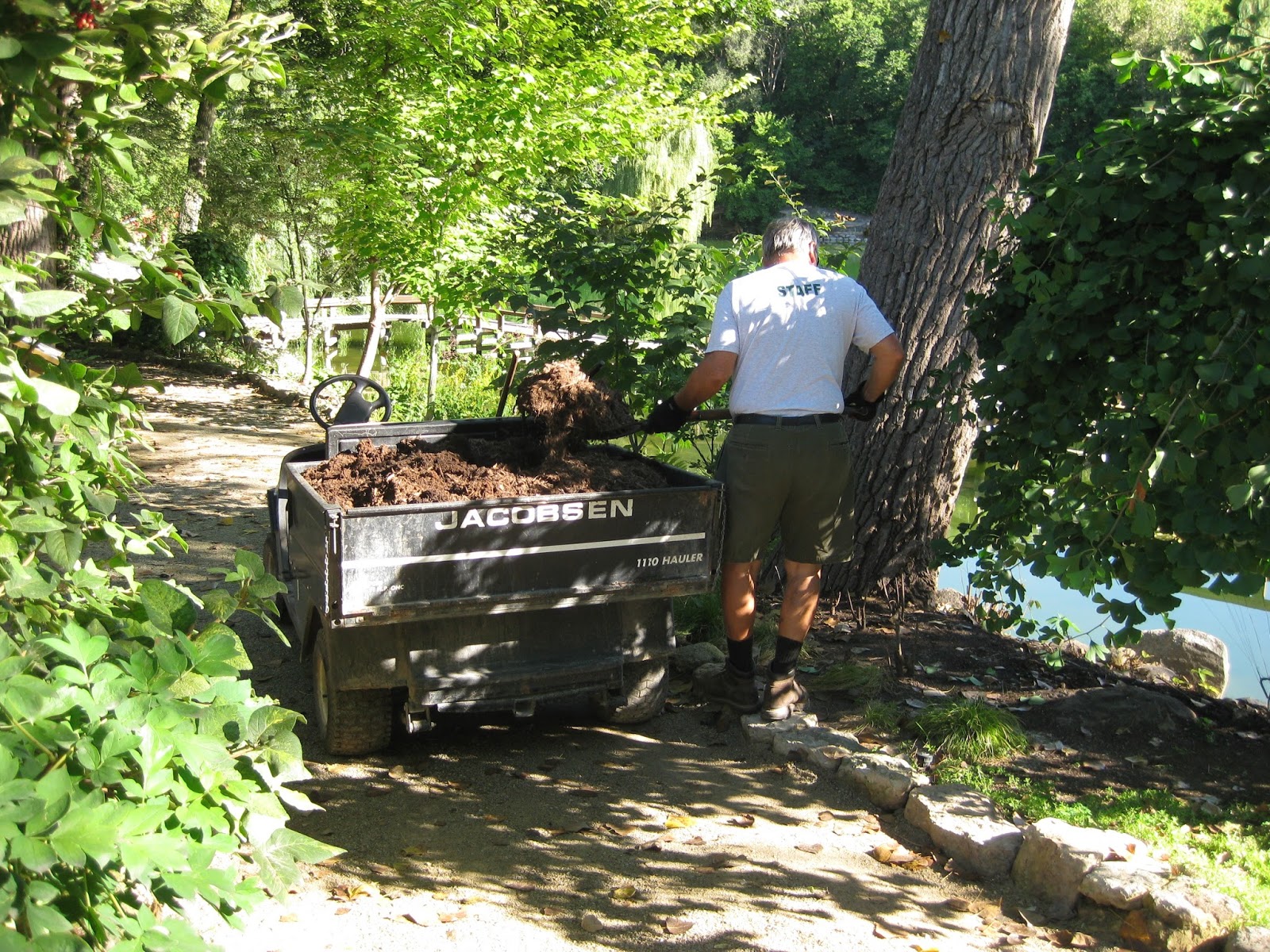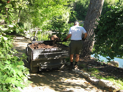 With a long weekend, the volunteers were refreshed and ready to go. Due to the Monday holiday, many of our Monday volunteers and Grumpies shifted to this Tuesday morning so we had a great crew of volunteers. Kay (above) and Eva (below) spent their time tidying in the Scottish garden which is also seeing lots of cottonwood (Populus deltoides) leaves fluttering down. This was new territory for the ladies and they're simply helping Jan, the assigned garden volunteer for that space, with some of the late season duties that accumulate quickly this time of year. Dr. Gredler (second photo down) was in for mowing duties as was Bill O. Stan came in to work in the Japanese garden and Maury was in to run some errands for us. The Grumpies were well represented. The third photo down shows Ron B. moving plastic flats to make room for incoming mums for the Fall Plant Sale (see our website for details). The next photo down shows Bob C. (left) and Ron P. raking leaves around the gardens. Del and Gene were also helping collect leaves while Gary went and watered our new trees. Many of the guys shifted to other projects and we saw Ron Y., Vern, Dave T. and Jim D. in the carpentry shop working on some new benches. Dick H. ran to the dump and helped with other duties as well. We also saw Sandy C., Deb G., Dr. Yahr, Denise and many others.
