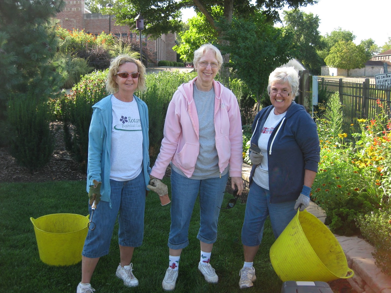 Above is a nice framed shot through the Parker Pen World Headquarters archway (on permanent loan from the Rock County Historical Society) down in to the colorful sunken garden. Today also had a cool start although we'll just have to get used to that as we are heading in to fall in a couple of weeks. The daytime high temperatures should still be nice this week but what we really need is a nice soaking rain. We are keeping up with irrigation and sprinklers but Mother Nature does the most thorough job with a nice, steady rain! We saw lots of kids out in the gardens today as part of the Story & Stroll program which has really become very popular over the last couple of seasons. I like to think the kids will remember the gardens as they get older and be future supporters, members and volunteers. We had a hearty crew of grounds folks and volunteers today and we are subtly shifting to more garden clean-up (leaves), continued watering and late season tasks. The color is still holding nicely out in the gardens and we'll extend it as long as possible. Below are some additional shots from this morning.
