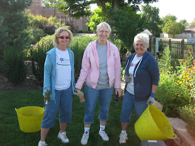 Volunteers were a big help today. Janet T. was in early to work on her lime border (see further below) and she always does such a thorough job. Ron K. spent significant time in the woodland walk garden and is balancing his time between leaf collection, planting and general tidying. Above are Kay (fancy red pants) and Eva in the Scottish garden helping Jan (below). That garden has received lots of leaves and this trio did a great job tidying up. Kay and Eva split up later to go tackle leaf collection in two other areas. The second photo down shows (left to right) Mary, Nancy and Myrt who collectively weeded in the Nancy Yahr Memorial Children's Garden and collected leaves in the woodland walk garden. We saw Marsha M. out doing her photography this morning as well. Nancy N. was in for librarian duties with our reference library and Vern was working on carpentry projects. Janice was in to work with the Chestnut House students and they did a great job with leaf collection and some other tasks here at the gardens. I'll show some pictures of them tomorrow. Dr. Gredler came in for some mowing and turf repair and we also saw Dr. Yahr, Chris W., Maury, Karen and many others.