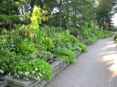 The grounds crew had a wide range of gardening activities today. Cindy (here for a half day) tidied the front entrance garden (leaves) and spent more time in the All-America Selections (AAS Display Garden). She also picked a huge batch of eggplant from that garden too. Pat (also here a half day) watered the new parking lot boxwoods (Buxus 'Green Velvet') and trees. He also finished mulching a section, watered the yard and collected many loads of leaves from the Hosta Hollow, Fern & Moss Garden and other locations laden with cottonwood (Populus deltoides) leaves. Cheryl was on a whirlwind tour of tidying up, weeding and planting. She does a great job and no weeds escape her notice. Terry edged the Palmer Drive curb line which is quite a distance. He also set up sprinklers, watered containers and continued other edging projects. Big John ran irrigation, watered containers, set up many sprinklers, planted and had some other projects going as well. I placed plants for installation, helped with volunteers, gave a brief tour introduction (a group from UW-Stevens Point) and continue to get ready for the Fall Plant Sale (see our website). I have our shrub listing now but you'll just have to come to the sale and see what we'll have!