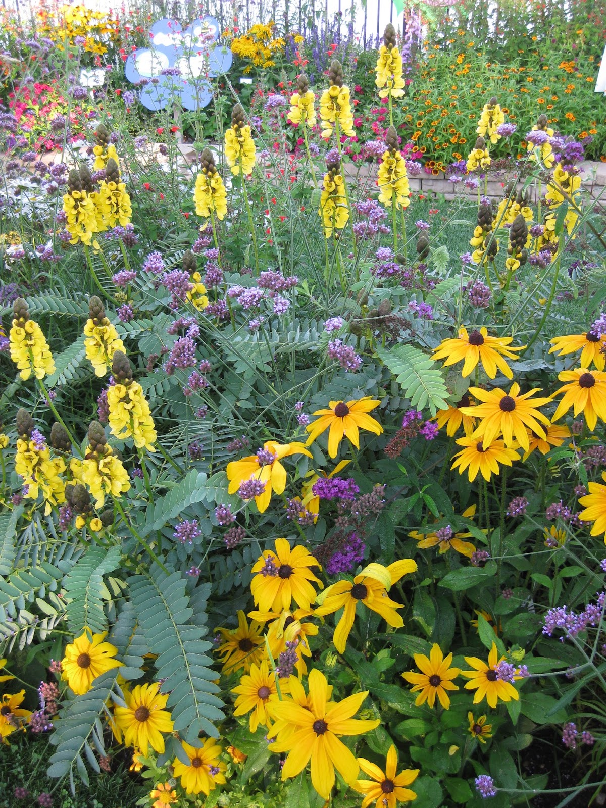 a floral "corsage" in the "Pollinator's Paradise" - note the yellow spires in the back of the popcorn plant (Cassia didymobotrya) which smells like buttered popcorn! - annual