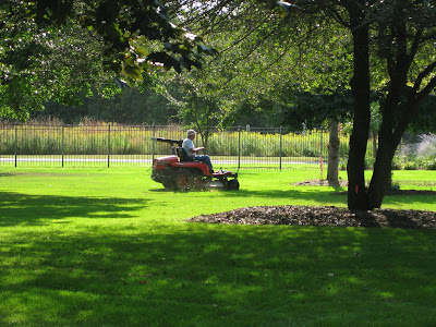 I didn't keep up with my typical images of our fine volunteers today as I was caught unloading mums and getting ready for the big plant sale. However, we had a nice turnout of helpers including Bill O. (above) who came in early to mow the arboretum. With an early wedding in the sunken garden today, we like to have all the mowing done and loud equipment work finished. Dr. Gredler also came in for his mowing duties. Vern was in for carpentry projects almost the entire day. Del came in and helped unload mums. Kay (below with her ninja bandana) did a nice job collecting debris in her assigned section of the shade garden which has an overhead canopy of cottonwoods (Populus deltoides). The trunks behind her are all from 50' tall cottonwoods with thousands of leaves just starting to flutter down. She collected multiple loads with more to go! Eva and Terri spent the morning tidying up the sunken garden for the upcoming weddings (three in that garden). They did a great job. Ron and Bev W. both came in as well and also helped in that area. Ron did some solid clean-up work and Bev has done a fabulous job maintaining her corner of the sunken garden. The second photo down shows the team tidying up after Dr. Gredler mowed the turf. We also saw Bev I., Deb G., Maury, Dr. Yahr, Kris K. and many others.