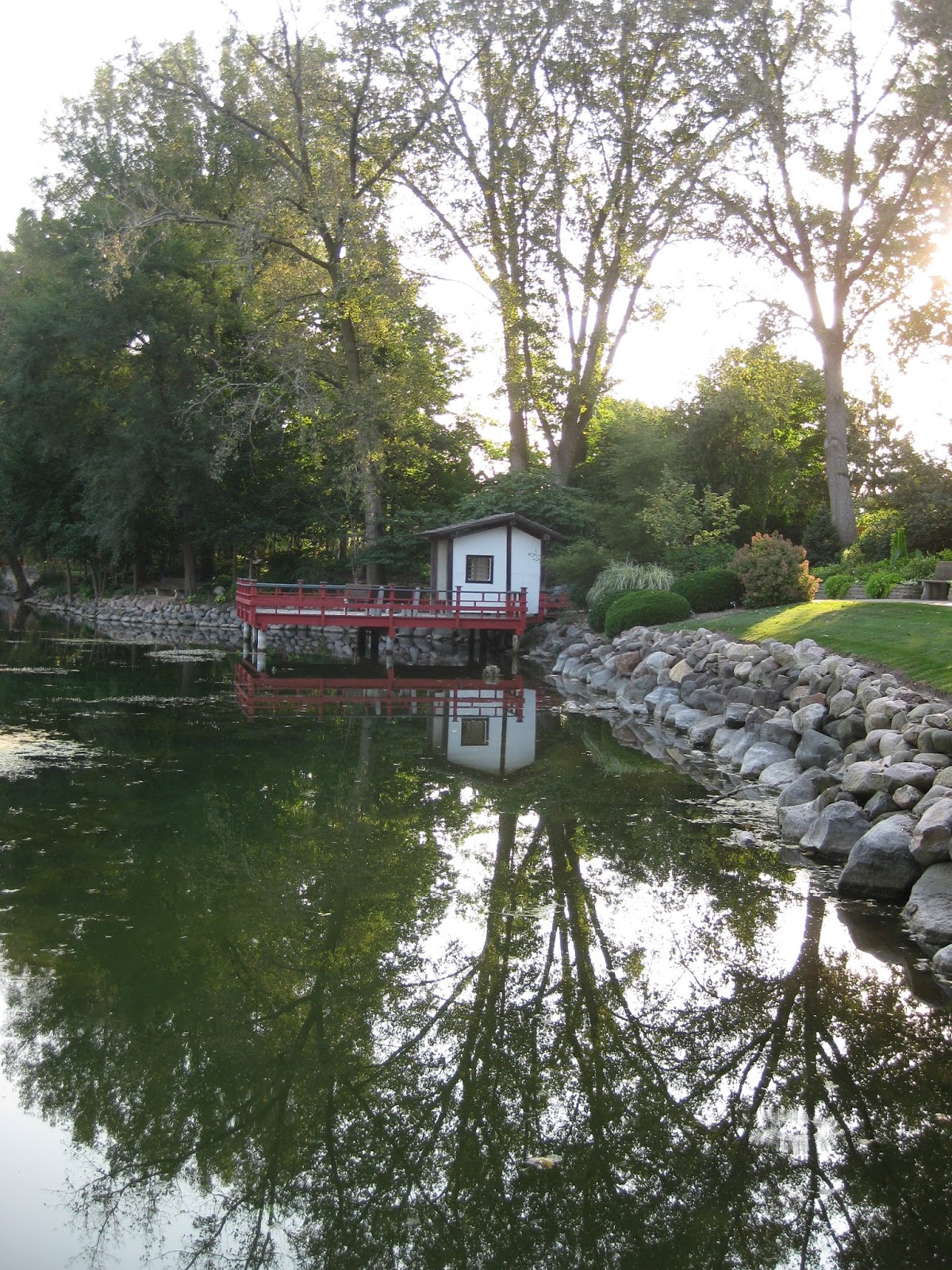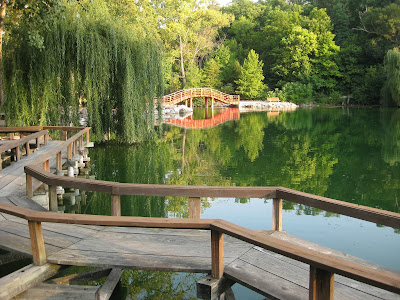 the arched bridge in the distance and zig-zag bridge in the foreground