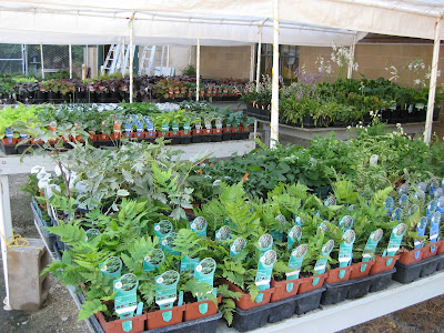 We had a successful Members Only Pre-Sale for the Fall Plant Sale today and saw steady traffic throughout the day (9 am - 4 pm). We had quite a crunch in the morning with a strong focus on mums. However, lots of plants could be seen walking out of the sale and we were happy with the overall amount of plants sold. We even had some visitors become new members right at the sale so they could shop and get the 10% discount (which extends over the entire sale both tomorrow and Sunday). Dr. Gredler can be seen above transferring some mums the best way he knows how right to his car. He also did some serious mowing out in the gardens as did Bill O. There were many volunteers helping throughout the three shifts for the plant sale and I'd like to offer a collective "thank you" to all the good helpers. It would be tough to name them all but we sure had a wonderful collective effort. Some of the more photogenic volunteers are featured below. Everyone was in orange vests but below are Ron Y. (left) with his own vest (not quite regulation orange) and Ron W. (center) who brought his own orange vest. Ron W. was a huge help greeting everyone coming in to the sale. He also encouraged new memberships for those that wanted to shop immediately and weren't current members. The handsome couple on the right (photo below) are Kathy and Tom Hoffman from Jenka Blossoms. They are great folks, now retired from the nursery business, and are the ones that generously donated three small greenhouses to the gardens last fall (much appreciated). They also did some damage in the sale and the back of their truck can be seen further below!