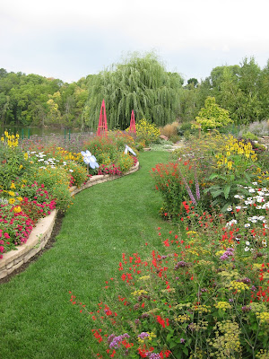 We didn't get much for rain today with only two brief spurts. I had hoped to see wet ground when I woke up this morning but no such luck. Madison had rain this morning...Rockford around the lunch hour and Janesville in the middle was missed again! We had a great day at the gardens though with preparations for the sale and lots of gardening in multiple locations as well. We had many volunteers assisting in the plant sale and a fair number were out in the gardens this morning. Our normal Wednesday contingent of volunteers did a nice job gardening which continues to be a strong focus until we get hard frost in October. We primp and tweak all our gardens throughout the month and later frost (unlikely) would allow for extended interest well in to October. The watering is becoming more important and we are starting to place sprinklers in areas that rarely need it (shrub borders). Above is a nice shot in the "Pollinator's Paradise" this morning where I ran in to Marsha M. taking photos. We couldn't believe all the hummingbirds in this garden and hope visitors will encounter them as well. Marsha was trying to capture some hummingbird shots which are hard to come by as they don't cooperate with posing properly. The Red Cross had a blood drive over at the Parker Education Center (see below) and there seemed to be decent traffic for that event as well (nice to see!). Further below are some other shots from today.