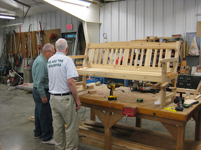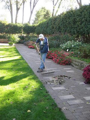 We had a great assortment of volunteers today helping out in the gardens, at the Horticulture Center and with the plant sale. Thanks to Alice, Joy, Pat, Terri, Mary and Roy for helping with the Fall Plant Sale Clearance today (15% off). It's hard to believe that the fall sale used to be over two weekends and run about 13 sequential days! Our Grumpies did some great garden clean up today as there were many leaves down after the rains yesterday. Above is Larry H. in the sunken garden working with Lloyd (directly below). Gary (next photo down) also did a nice job collecting leaves. Bob C. and Gene finished hauling our holiday lights from garage storage to the Horticulture Center for future testing and repair. The guys then moved on to leaf collection out in the gardens. Rollie took down all the rope, posts, etc. out in our temporary parking lot. Ron W. came in for some clean-up duties as well. Vern, Jim, Dave and Ron Y. continued work on their three new memorial benches. Vern and Dave can be seen a couple photos down (note Dave's shirt that reads WE ARE THE GRUMPIES). Dick H. (third photo down) was a super handy man today and repaired one of our John Deere gators, a riding mower and then he cut more aluminum for our plant labels. Pat C. came in to create more labels and was later back to place them out in the gardens and swap out the old ones. Dr. Gredler was also in for his mowing rounds. Shirley H. came in and did a great job tidying up the reception garden, sunken garden and Nancy Yahr Memorial Children's Garden. Betty H. was also in for the tidying efforts in her two assigned garden areas.