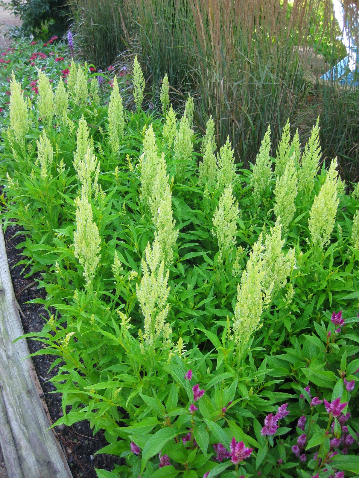 It's tough to categorize lime as a color in the garden. As a variable (and subjective) color, lime can encompass a wide range of greens and head in to the "chartreusey" range. Regardless, the point of my blog is to emphasize effective seasonal plants that can offer some fun greens and bright lime components with flower and/or foliage. Above is a chartreuse flowering tobacco (Nicotiana langsdorfii) which really looks dynamite with these bright pink petunias and the 'Purple Majesty' ornamental millet (Pennisetum glaucum) in the background. Lime can offer a nice punctuation when combined with darker colors and can certainly brighten up a container or sunny border as well. This blog focuses on seasonal plants but keep in mind the value of lime/chartreuse as it also relates to the flowers and/or foliage of perennials and woody plants too. In 2013, we had two areas with a strong lime theme (see the next two photos). They were very effective and note the use of the vining obelisks that were painted to give a nice lime vertical element along both long borders. Read my blog yesterday for more information on our obsession with obelisks at RBG. See further below for my tribute to lime and its impact in the garden. Do consider a "seasonal dash" of lime in 2014!