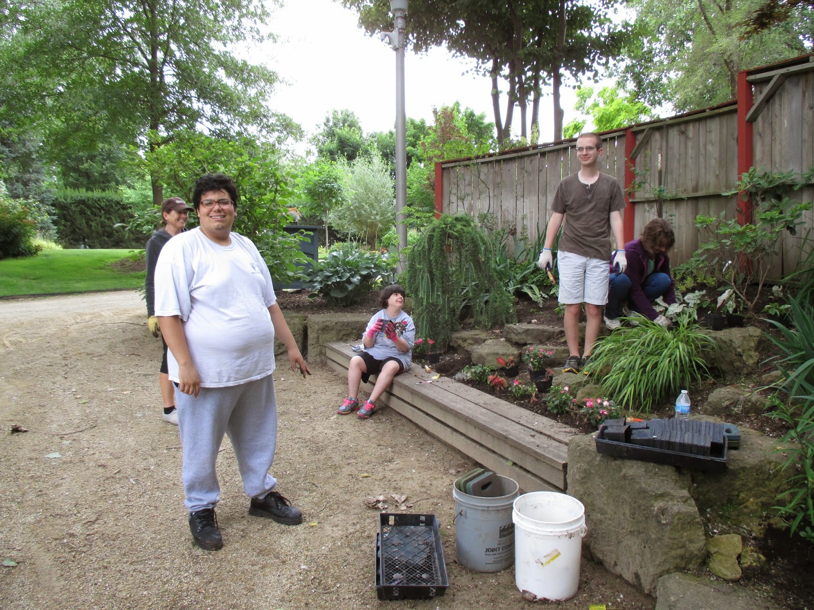 Above are Kathy (left) and Patrea weeding the entrance garden slope which became very weedy quite quickly. I think half that large space is weeded and we'll finish the rest by early next week. We also had some planting help from Myrt, Nancy, Gena and a friend of theirs (bad memory regarding her name!). They planted a lot of plants in the Jungle Garden (directly below). The second photo down shows Jan R. in the Scottish garden which she has tended faithfully (and exceptionally) for the past 16+ years. Kay (third photo down) did a nice job weeding along our "red wall" planting which also has a purslane (Portulaca oleracea) problem! Dr. Gredler came in for mowing and Vern worked on some carpentry projects. The fourth photo down shows Janice (far left in the back) working with our Chestnut House volunteers who did a great job planting in the azalea/rhododendron garden. We also saw Maury, Nancy N., Deb G., Dr. Yahr and many others.