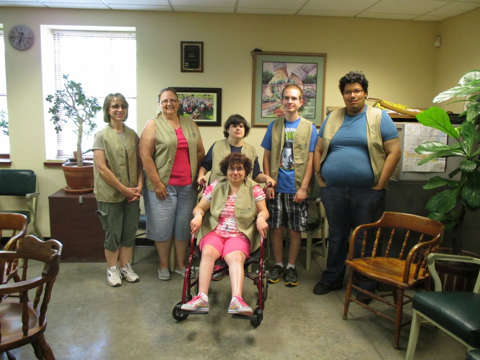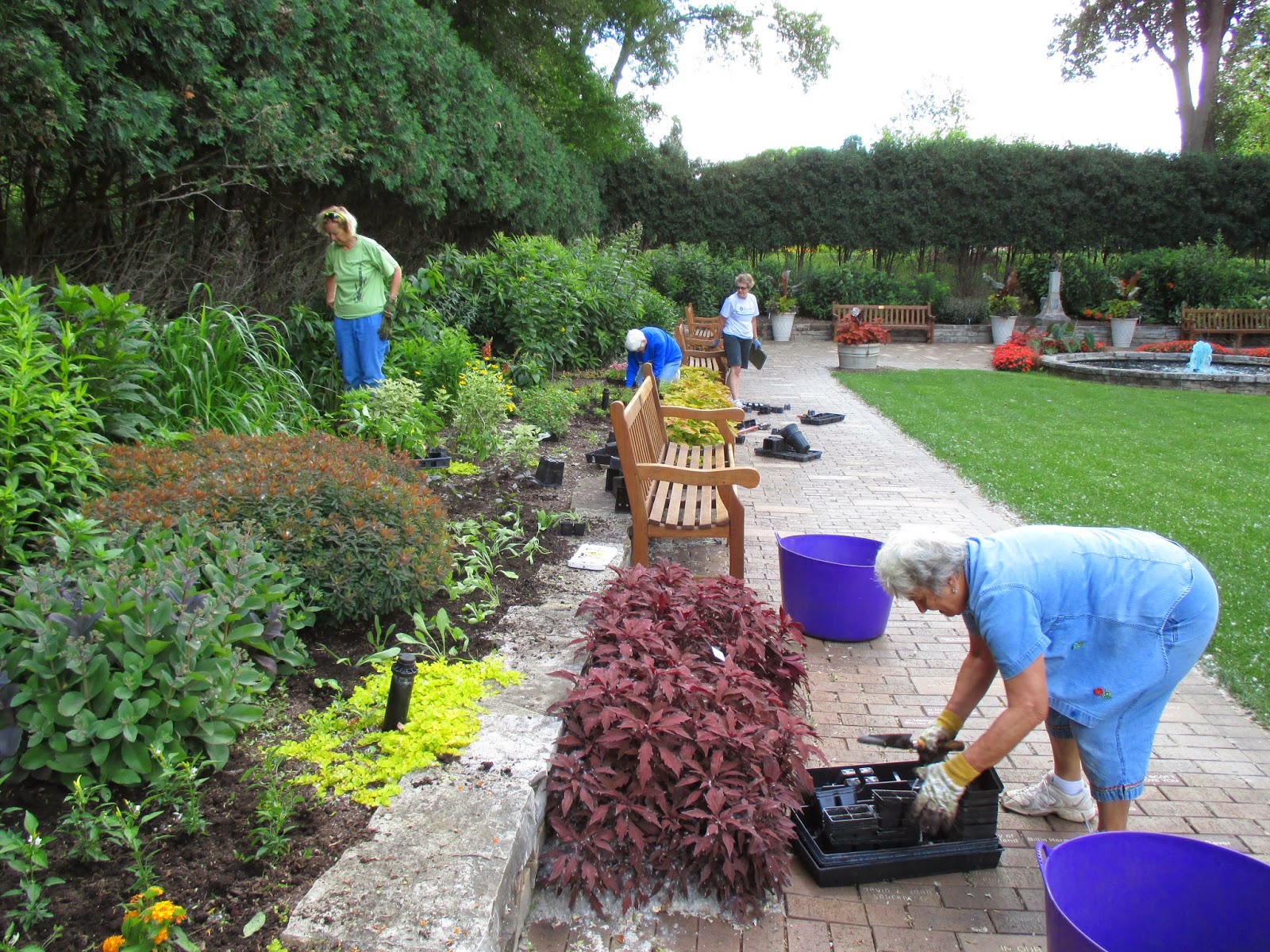 Kay (above) was one of many volunteers out in the gardens today and this would be a rare time that she didn't have weeds in her stranglehold! She did a superior job tidying up her section of the shade garden and it looks dynamite. Pat R. helped Cindy weed in the Nancy Yahr Memorial Children's Garden and the ladies opened up space for our last wave of planting in that space on Friday. Below is our talented quartet of Mary, Nancy, Myrt and Gena. The ladies installed over 500 more annuals along this sunken garden border and spent the remainder of their time weeding in that space. We have more plants to install down here and will likely do it yet this week. Jan R. was in to tidy up the Scottish garden and Dr. Gredler came in for mowing duties. The second photo down shows Marcia (left) and Mirjam in the English cottage garden where they continue to make this space Spectacular with a capital S. The third photo down shows Patrea (foreground) and Kathy in the reception garden for fruitful weeding after finishing the entrance garden. They did a great job. The fourth photo down shows Betty in the back tackling weeds in her assigned garden space. The Chestnut House volunteers (seen above) did a great job as well and Janice was in to help coordinate their efforts. Victoria can be seen in the fifth photo down maintaining her planter. We also saw Dr. Yahr, Glenn D., Mary Kay T., Sue S., Janet M., Cora O. and many others.