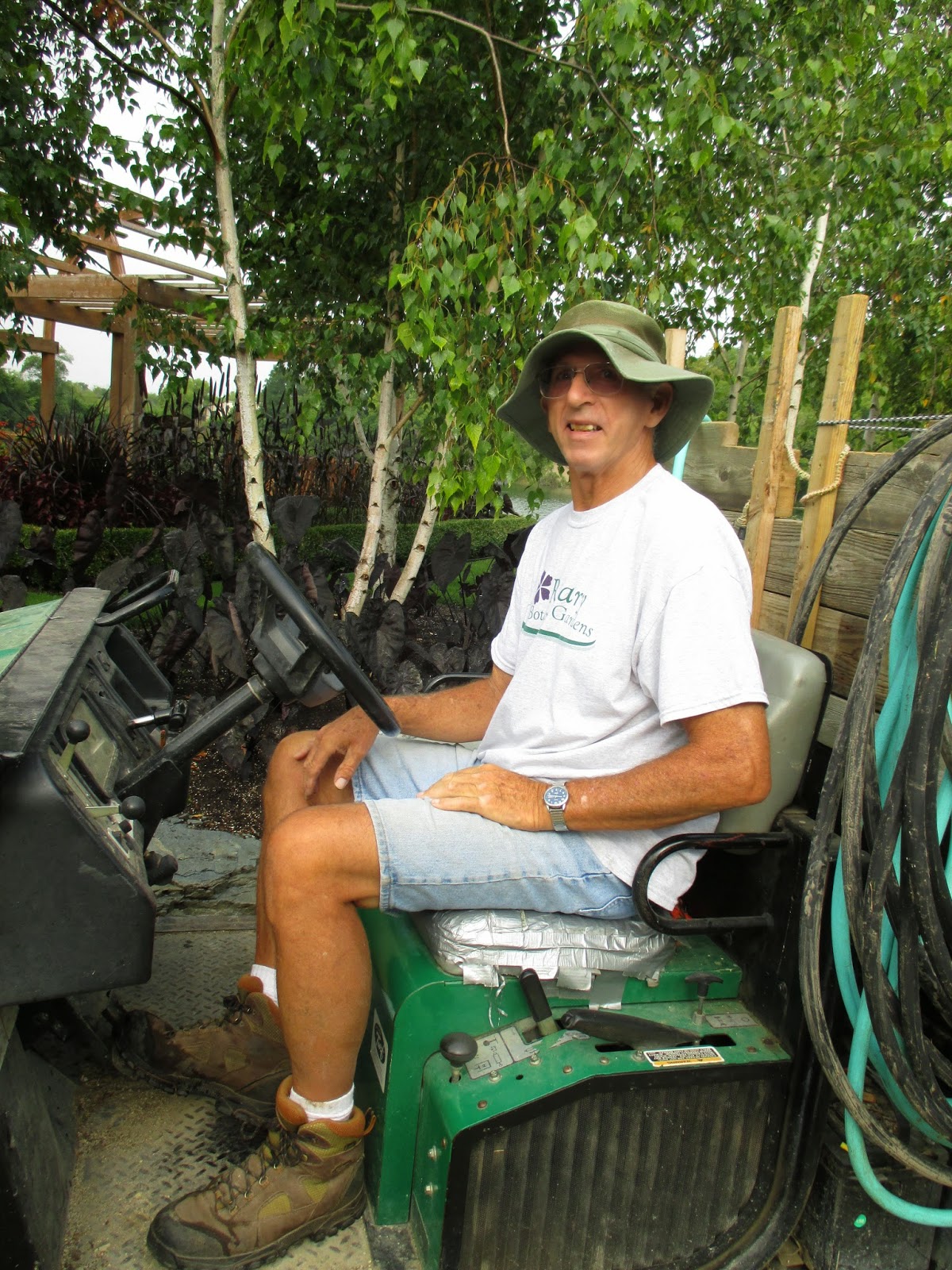 Despite the expression on Gary's face above (the driver), the volunteers had an enjoyable and productive experience today. Gary and Bob above worked on mulching with Lloyd and Ron R. in the main parking lot area (seen directly below). The guys spread a lot of mulch and ended up going through our entire pile. The second photo down shows Bob K. working on sign installation. Bob is a retired electrician and very handy as evidenced by all the other tasks he did for us today. Eva was our sole Grumpette and she weeded in front of the main building and will finish tomorrow. The third photo down shows Ron B. watering in the Thomas Jefferson Collection and Gary S. can be seen in the fourth photo collecting early cottonwood (Populus deltoides) leaves that are drifting down already. Kevin also collected debris and Maury ran errands and worked on other tasks as well. Jim, Dave and Vern all worked on carpentry projects and Dr. Gredler was in for mowing duties. Jenny E. came in later this morning to tidy up the hosta hollow garden which looks great. We also saw Chuck S. (had a cart tour) and many others today.