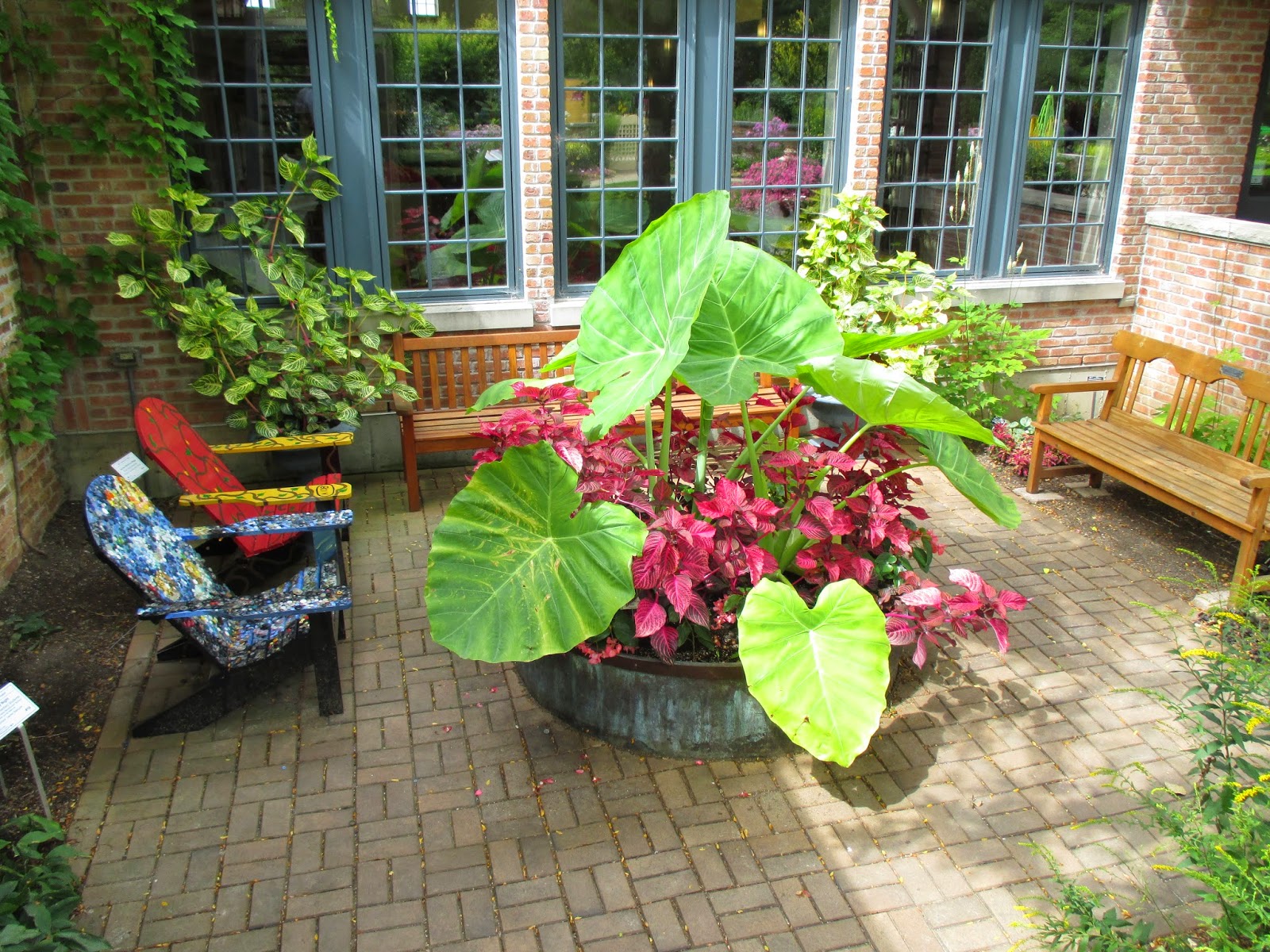 We had an 80% chance of decent rainfall last night and we missed it! We did have some mist for about an hour this morning but it didn't amount to much at all. A soaking by Mother Nature would have been very timely and much appreciated. The day was overcast and it was a cool, breezy day around 75 degrees F. This cold weather pattern continues to emerge but it looks like we'll get some hotter days later this week. The garden was very vivid in this lighting though as seen by a portion of the formal gardens above and the Adirondack chairs and surrounding plantings below (in the Nancy Yahr Memorial Children's Garden). We didn't have a lot of volunteers today but had quite a few grounds staff out in the gardens. Unfortunately, watering dominated the day for many although the overall weed population continues to quake in fear and is reduced in numbers daily! Further below are some additional shots from the garden this morning.