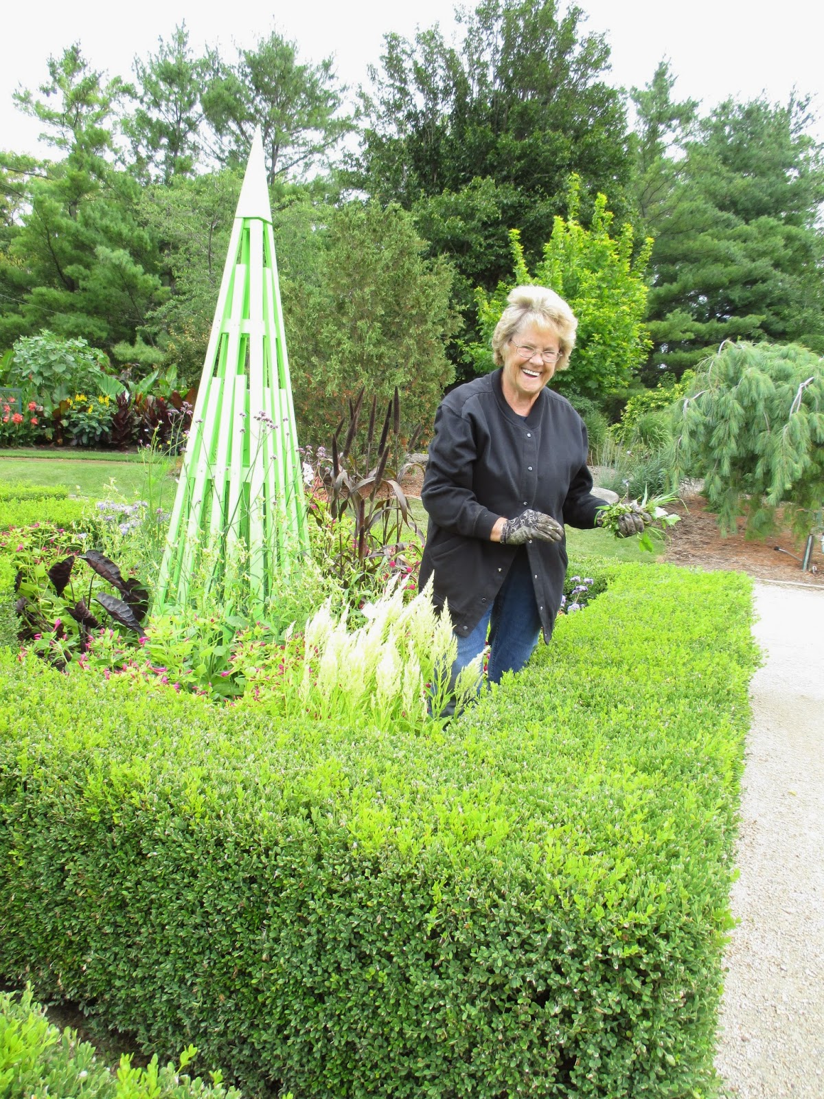 Three of our volunteers can be seen above. I took this photo after watching them chat for 10 minutes and prodded them to get out there! From left to right are Kay, Kathy and Eva. The ladies had a busy morning out in the gardens and thankfully the cold mist didn't dissuade them from all their wonderful progress. Kay weeded multiple areas and collected quite a bit of debris from the color rooms and sloped gardens near Palmer Drive. Kathy (seen below too) and Eva did weeding near the formal gardens and addressed multiple areas. Ron K. was in to tidy in the woodland walk and helped Urban with some serious shrub and tree pruning along the shoreline adjacent to the arched bridge. Bill O. was in for mowing duties and Gary S. did some label work. Our Garden Development & Maintenance Committee met this morning as well and included Big John, Iza, Dick P., Maury, Gary, Christine R. and Dr. Yahr. We also saw Chuck, Mary W., Dick H. and many others today.