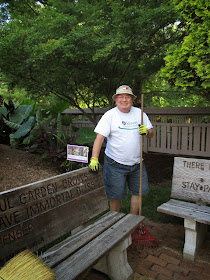 Our volunteers continue to maintain the high quality out in the gardens with their various projects. We had a nice turnout of volunteers today for sure! Above is Gary B. who worked with Ron R. on a significant mulching project near the Japanese garden today. Bob C. and Ron B. were off in another area also working on a mulching project. Our Grumpettes focused on weeding and tidying in multiple areas. Directly below is Bonnie who did a nice job in the Jungle Garden with some weeding and "jungle trimming needs". The next photo down shows our camera shy Marilyn behind a leaf of the 'Thailand Giant' elephant ear (Colocasia gigantea). Marilyn and Winifred were working with Bonnie on the same projects in the Jungle Garden. Suzie (third photo down) did some weeding in the shade garden and Vicki spent the morning weeding in the alpine garden. Kathy (fifth photo down) and Eva finished weeding in the reception garden and Hal and Doris were in to tidy their area and help weed in the gazebo garden. Olive (fourth photo down) was out with her wagon and buckets cutting some fresh arrangements. Mary Ann G. did a nice job tidying out in the Thomas Jefferson Collection. Dr. Gredler was in for mowing and Dick H. made trips to the dump and worked on other projects as well. Dave, Jim, Vern, Ron Y. and Bob K. worked on myriad carpentry projects too. Jumbo Jim brought down the RECAPPERS for some afternoon work primarily in the Japanese garden. Mary H. and Kathy P. were in this afternoon to tidy their assigned garden too (looking nice). We also saw Dr. Yahr, Ron W. and many others today.