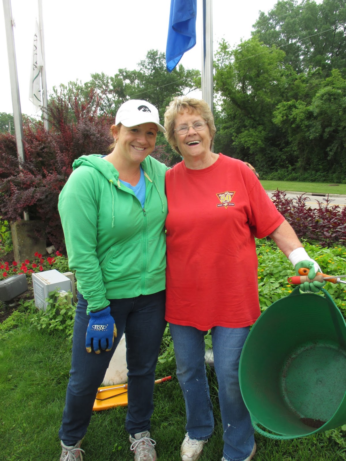 Our volunteer crew did a great job out in the gardens. Barb (above) planted another 50 or so large tropicals in the Alphabet Jungle Garden and was joined later by Vicky for some serious weeding in that same space. Directly below are Resa (left) and Cookie as they headed out to the North point garden which they tend so well. The ladies tidied up and helped with some work in the Smelly Garden and surrounding areas as well. The second photo shows Pat C. in action. After some clerical work, Pat and I went out and inventoried labeling needs in the gazebo garden and a portion of the woodland walk garden. We're looking at label replacements, repairs and plants that need labels too. This is an ongoing process although we hope to get caught up this year! Jenny was in to tidy up the hosta hollow garden (her assigned space) and later joined Kay (third photo down) with some weeding near the gazebo garden after Kay finished her two planting projects (one of which can be seen in the photo). Bobby K. (fifth photo down) installed more sculptures and spent a good portion of the day helping organize the carpentry section of the Horticulture Center. Pat M. came in for some projects and Bill O. did his mowing rounds. Kathy and Eva (sixth photo down, Eva in red) continued their weed battle in the entrance garden and continue to make great headway. We also saw Mary H. and Kathy P. tidying their area and Maury was around for multiple errands. I feel like I'm forgetting some volunteers but we sure had a great crew today!