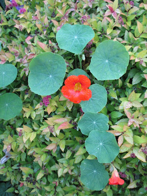 nasturtium (Tropaeolum sp.) continuing to climb this spirea