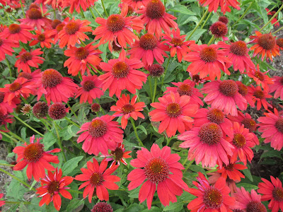 It's difficult to keep up with all the varieties of coneflowers (Echinacea sp.) and hybrids that have been introduced over the last 15 years or so. It has been nice to see such a great range of colors become available for the consumer but who can really keep up? They all look beautiful in the gardening catalogs but the "proof is in the pudding" as they say. I commit to an Echinacea variety once I've seen its performance in the ground which should reveal not only true color but stature in terms of "stem strength". I rarely order a variety based on a photo of the flower. I feel many of the new varieties, while beautiful, lack the stem strength to support the flowers and become a floppy mess that requires staking. My concern about flower color also revolves around how flowers "age" on the plant. Do they maintain a nice degree of the original shade (white, orange, yellow, purple, red, etc.) or do the older flowers look unsightly and detract from the overall appearance of the plant (despite vivid new blooms)? I have been VERY smitten with the Sombrero series which has the best features of strong stems and excellent coloration throughout the bloom period. Above and directly below is Echinacea Sombrero Flamenco Orange ('Balsomenco') which is my current favorite of the series of eight selections. Most of these are in the 24"-30" range and are great for wildlife as well. Purple coneflowers (Echinacea purpurea) and their hybrids that include this parentage are not long-lived perennials. It's important to note this fact and understand that getting 2-3 years out these plants is typical and should be considered when they are purchased. I feel they are certainly worth the "real estate", particularly this Sombrero Series.