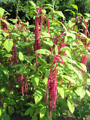 I think I've planted and enjoyed love-lies-bleeding (Amaranthus caudatus) every year for the past 25 years or so. This classic annual has such excellent character in the full sun border and always invites closer inspection including touching those soft flower panicles. Native to Africa, India and Peru, this plant is also called pendant amaranth and foxtail amaranth and will reach heights between 3' and 7' in height. The drooping panicles come in all shades of pink as well as green and can reach lengths of 12"-24". Sometimes staking is required although this plant will tolerate both arid or humid environments. The green form, 'Viridis', is equally attractive and offers some nice texture as well. The variety 'Dreadlocks' seen further down has the arching and dangling panicles but the flowers are clustered making for a very interesting appearance. These can all be found easily from a wide range of seed sources and vendors.