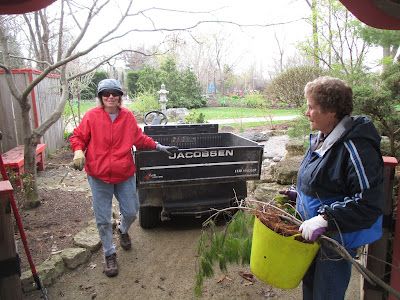 Our volunteers accomplished a wide range of activities today. Kay (above) tidied along the west road near the Parker Education Center and did an excellent job cleaning up this space which needed a lot of varied and intense TLC! It's looking great and Kay is "expanding her range" later in the week in that same area. Directly below are Eva (left) and Kathy who spent a second day in the Japanese garden collecting debris and making everything look nice. That garden requires the most care "per square foot" I would say, so we do have lots of focus on making it look nice. The second photo down shows (left to right) Gena, Myrt and Nancy. The ladies pulled a whole lot of thistle today near the Nancy Yahr Memorial Children's Garden and helped weed some adjacent areas. Bob, Bev and Deb were excellent today in leading the charge to divide another big load of daylilies. Along with help from two industrious RECAPPERS, these five accomplished a lot of work and continued well in to afternoon with additional tasks including rototilling. Janice had her Chestnut House volunteers on hand for a tour and some gardening as well. There are a few new volunteers in this group for 2016 so the orientation is important. We also saw Maury (errands), Bill O. (odds and ends) and many others today.