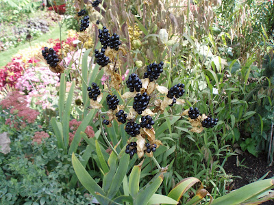 Belamcanda chinensis) received it's name. This perennial had orange, tropical looking blooms in mid-summer that have transformed in to these interesting seed clusters. These are frequently used in arrangements and are particulary showy (or more evident) when paired with plants with yellow or chartreuse foliage.