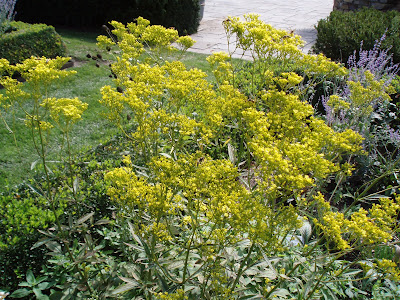As always, we've had a productive day. The Grumpies hauled plants, swept sand in to the cracks of our newly cleaned brick paths and patios and otherwise did their normal assortment of gardening tasks. Dick H. fixed our John Deere Gator thank goodness and has saved us lots of expense as a result of his handiness. Larry, Jerry and Janice were here as staff and we had a great weeding/cleanup crew of Geesje, Marilyn, Bev and Glenna. They created numerous piles of debris. They left a large garden area looking very tidy and we hope these beds will continue to extend the season until that imminent frost finds us. We're continuing to water as there doesn't seem to be much rain in the forecast and are looking forward to a productive work day this Saturday. The perennial below was new to me a couple of years ago and I'm impressed with its long duration of bloom. The golden valerian or golden lace (