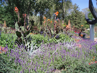 Tropaeolum sp.) in our herb garden. Nasturtiums are a great ornamental and there are many species to try at home. All parts of this plant are edible and there are many aesthetic and functional uses for Nasturiums. Incidentally, the Janesville Area Herb Society does a wonderful job taking care of the herb garden and has done so since the inception of the gardens. What a great, knowledgeable and organized group! Below is a nice shot of the blue/orange theme around our entrance sculpture. Should be another good week coming up!